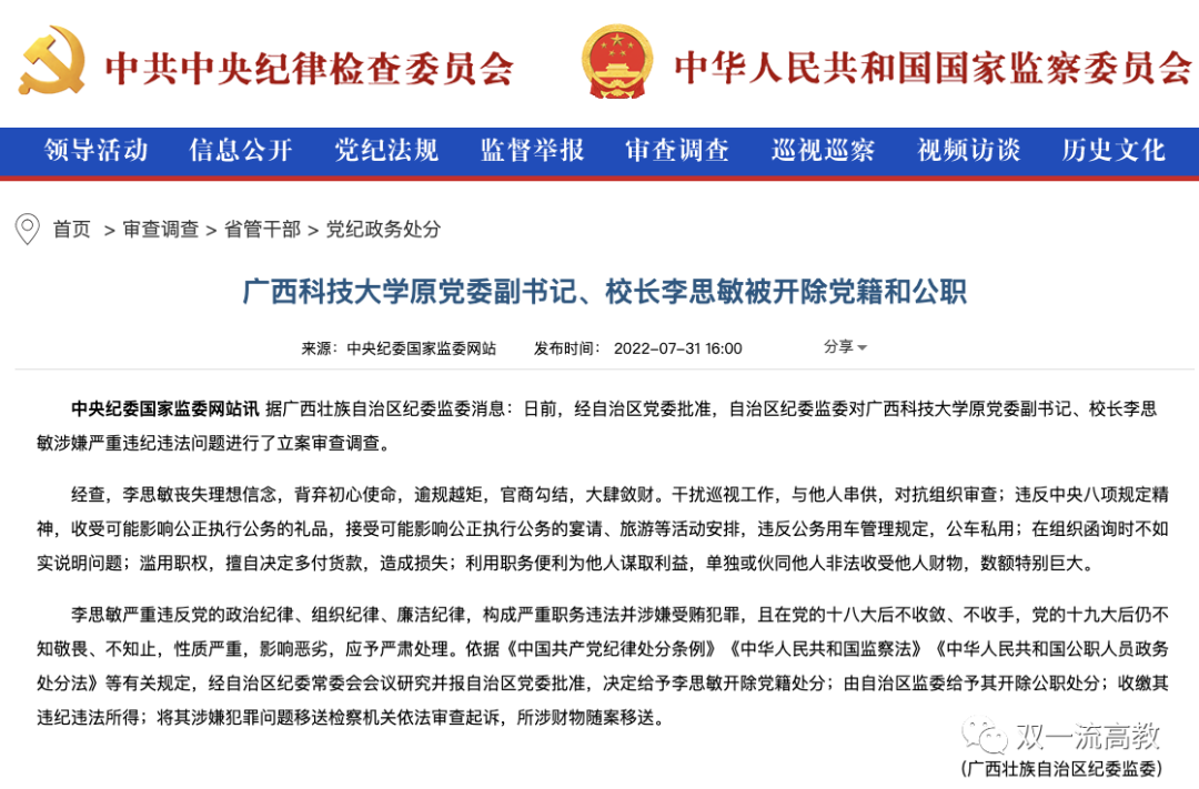 通报!受贿超1500万元!高校校长李思敏腐败细节获披露!