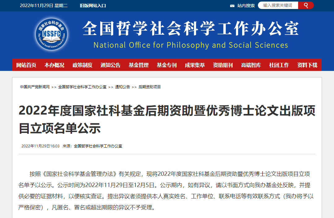 11月29日,全国哲学社会科学工作办公室发布《2022年度国家社科基金后期资助暨优秀博士论文出版项目立项名单公示》,公示时间为2022年11月29日至12月5日。