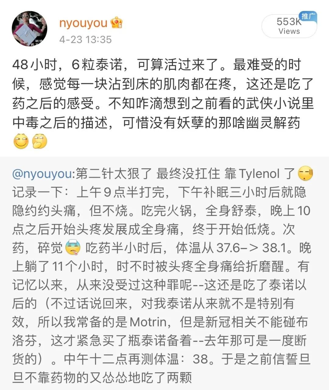 11月5日 20:46:Tylenol说六个小时就真六个小时嘿。昨天在课堂上坐着就开始哆嗦了(若不是昨天本来就请外援讲一节课,我也不敢在讲课前一天打第三针),幸好早有准备,3点半又补了两颗药。一直坚持到吃完晚餐,直接蒙头大睡。8小时后自然醒,体温已经降到37.6了。现在,37.1。这算是结束了。可以开心写paper了