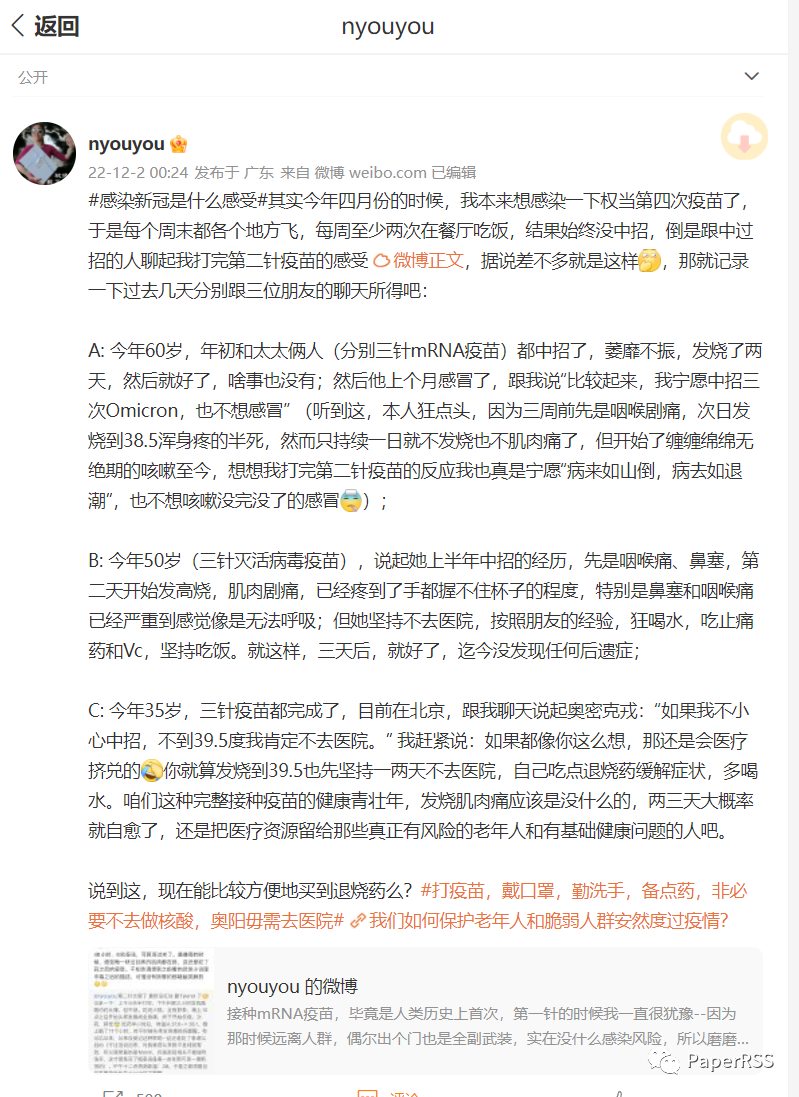 #感染新冠是什么感受#其实今年四月份的时候,我本来想感染一下权当第四次疫苗了,于是每个周末都各个地方飞,每周至少两次在餐厅吃饭,结果始终没中招,倒是跟中过招的人聊起我打完第二针疫苗的感受微博正文,据说差不多就是这样,那就记录一下过去几天分别跟三位朋友的聊天所得吧:
