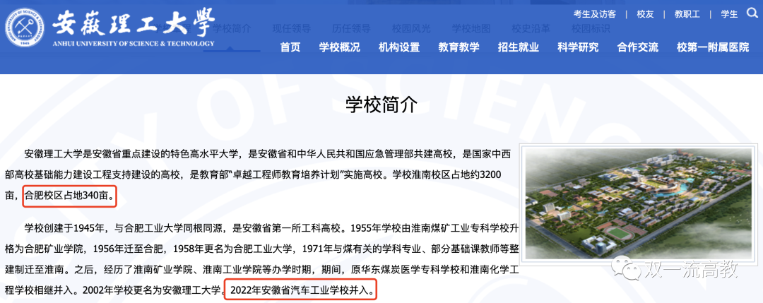 目前,学校的介绍中,安徽理工大学淮南校区占地约3200亩,安徽理工大学合肥校区占地340亩。另根据最新的官微介绍,安徽理工大学在合肥成立公共卫生学院、公共安全与应急管理学院、新能源与智能网联汽车学院、碳中和科学与工程学院。