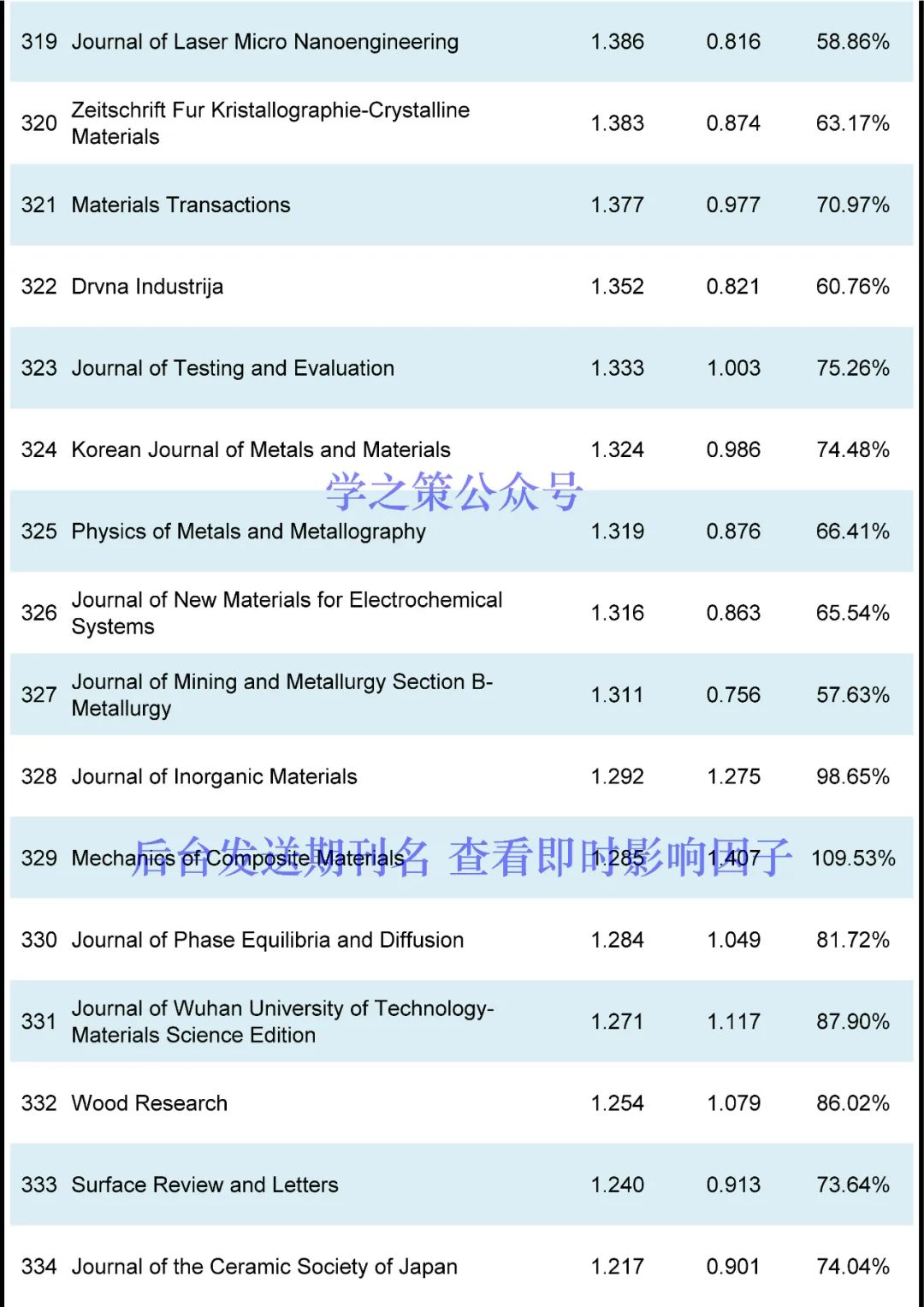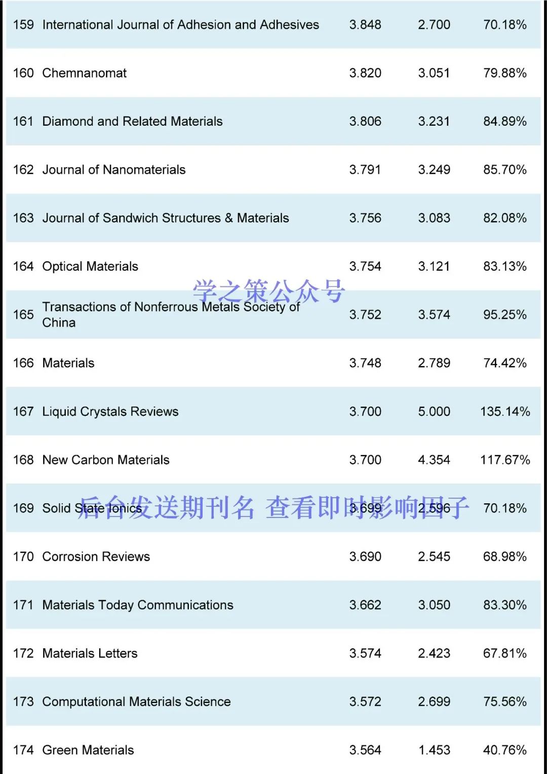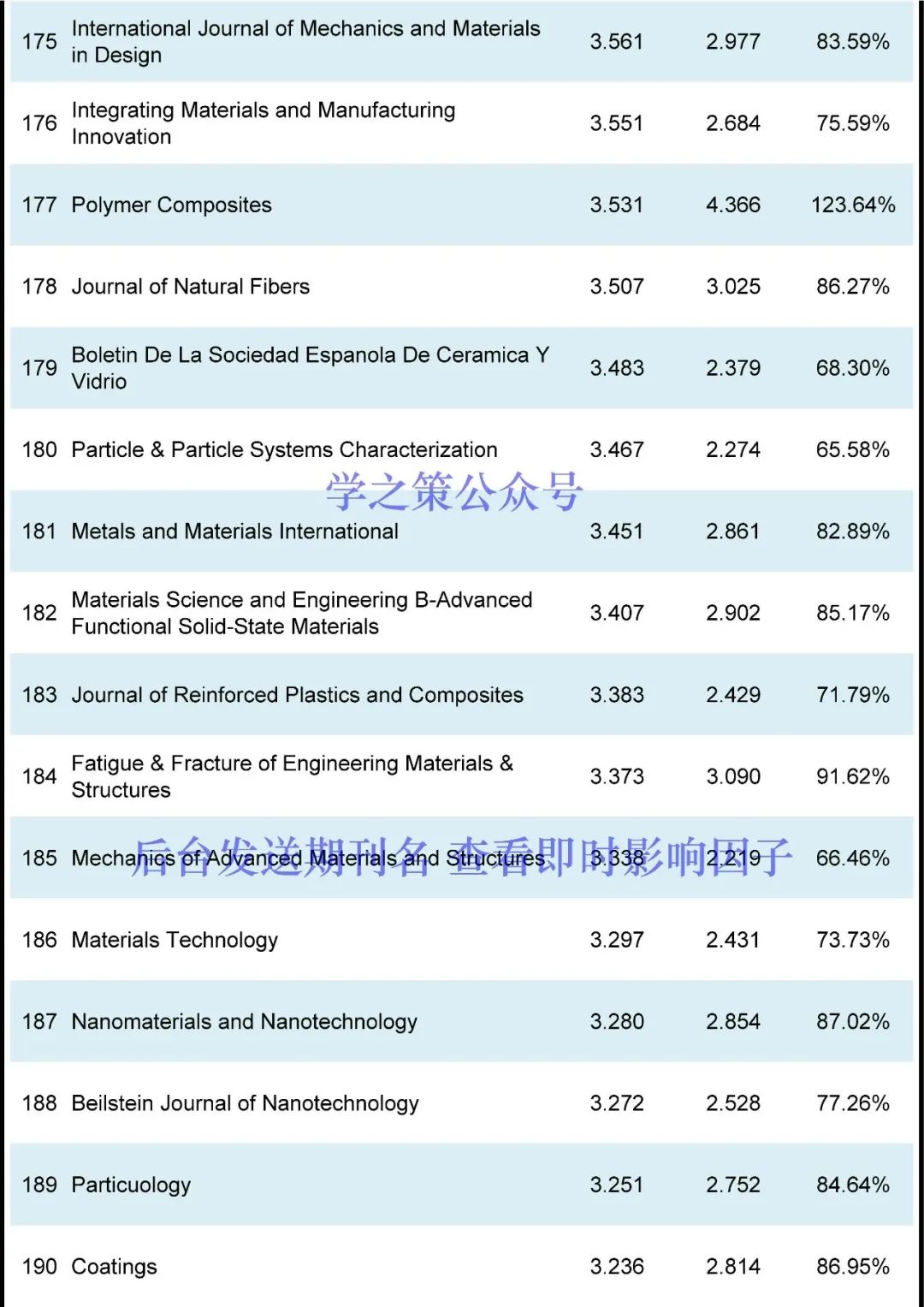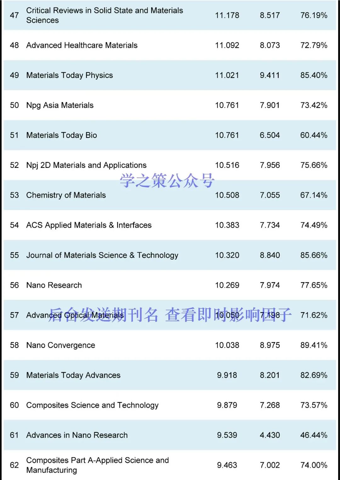 本期发布材料期刊(共计422本)的最新即时IF,更多期刊情况,可于学之策公众号后台查询。Nature系列:Nature Reviews Materials即时IF(76.679 → 67.283),完成度87.75%;Nature Energy即时IF(67.439 → 46.162),完成度68.45%;Nature Materials即时IF(47.656 → 33.722),完成度70.76%;Nature Nanotechnology即时IF(40.523 → 31.570),完成度77.91%;Nature Electronics即时IF(33.255 → 27.901),完成度83.90%。顶刊系列:Joule即时IF(46.048 → 32.244),完成度70.02%;Energy & Environmental Science即时IF(39.714 → 26.294),完成度66.21%;Advanced Materials即时IF(32.086 → 23.594),完成度73.53%;Advanced Energy Materials即时IF(29.698 → 22.229),完成度74.85%;Materials Today即时IF(26.943 → 18.655),完成度69.24%;ACS Energy Letters即时IF(23.991 → 17.981),完成度74.95%;Matter即时IF(19.967 → 15.318),完成度76.72%;ACS Nano即时IF(18.027 → 13.855),完成度76.86%;等。国产期刊完成度超过85%的有:Nano-Micro Letters即时IF(23.655 → 21.223),完成度89.72%;Bioactive Materials即时IF(16.874 → 15.296),完成度90.65%;Energy & Environmental Materials即时IF(13.443 → 11.619),完成度86.43%;Advanced Fiber Materials即时IF(12.958 → 12.880),完成度99.39%;Ecomat即时IF(12.213 → 11.038),完成度90.38%;npj Flexible Electronics即时IF(12.019 → 11.606),完成度96.56%;Journal of Magnesium and Alloys即时IF(11.862 → 12.450),完成度104.96%;Journal of Advanced Ceramics即时IF(11.534 → 13.950),完成度120.95%;Journal of Materials Science & Technology即时IF(10.320 → 8.840),完成度85.66%;Journal of Materiomics即时IF(8.589 → 8.112),完成度94.44%;Rare Metals即时IF(6.318 → 7.286),完成度115.32%;International Journal of Minerals Metallurgy and Materials即时IF(3.850 → 4.048),完成度105.13%;等。目前所有材料期刊的平均完成度为77.72%(上个月为68.87%),作为粗略的估计,目前的即时IF除以~0.7,估计比较接近明年的正式IF(个别期刊差异性会比较大)。(注:本文发布的仅为根据IF计算规则得出的当日即时IF,不是最终正式IF的预测。即时IF会一直增长,一般来说,每年3~4月的即时IF会比较接近当年最终IF。)