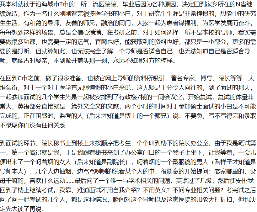 写下这篇文章,可能会有很多不为人知的潜规则暴露在公众面前,但正如手术一样,没有创伤,也无法治愈疾病,希望随着时间的推移,无数的潜规则能够暴露在阳光下,让医疗这个行业,也让现行的硕博士培养制度,在改革的浪潮中,变得更为公正、阳光、民主,让弱者的声音,不再软弱无力。