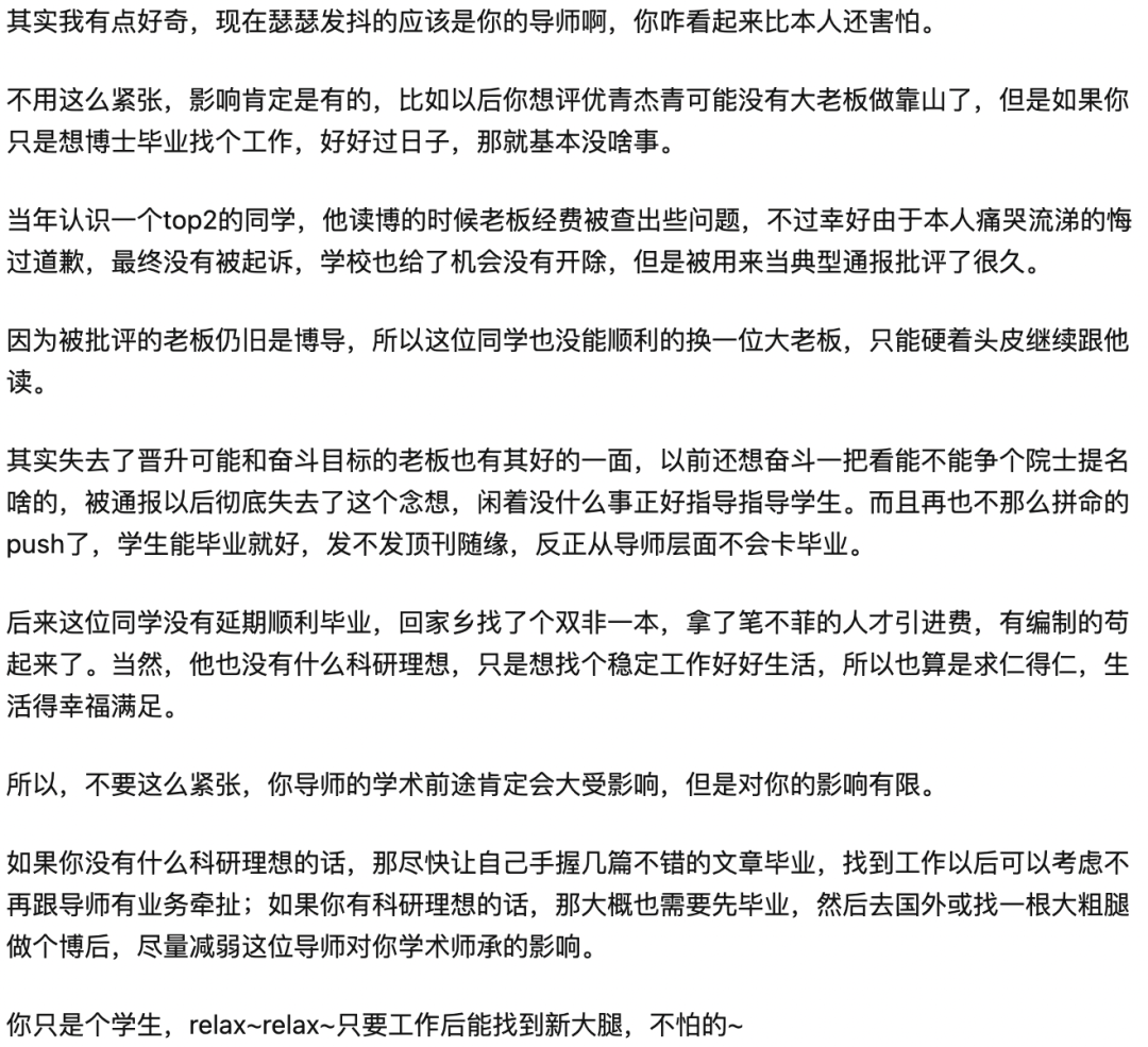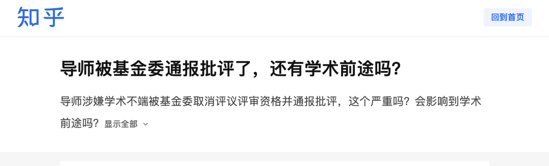 近日,有网友提问:“导师涉嫌学术不端被基金委取消评议评审资格并通报批评,这个严重吗?会影响到学术前途吗?”该话题引起了众多回复。
