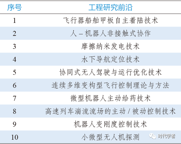 其中,属于传统研究深化的有人– 机器人非接触式协作、水下导航定位技术、协同式无人驾驶与运行优化技术、高速列车湍流流场的主动/ 被动控制技术、机器人变刚度控制技术和小微型无人机探测;新兴前沿包括飞行器船舶甲板自主着陆技术、摩擦纳米发电技术、连续多维变构型飞行控制理论与方法和微型机器人主动给药技术。