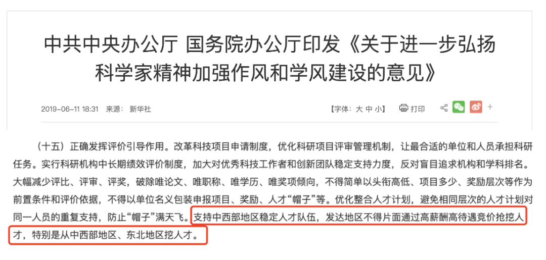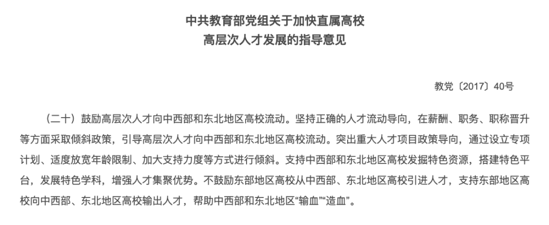 在比拼财力、盟友的抢人大战中,孤军奋战的中西部、东北地区高校,手中除了一张情怀牌,再难有招架之力,大量的高端学术人才曾一度流往东部。“这些年,兰州大学流失的高水平人才,完全可以再办一所同样水平的大学!”原西北师范大学校长王利民多年前的这声控诉,已是家喻户晓。据原兰州大学物理科学与技术学院院长薛德胜回忆,2006年,当他接手院长一职时,“整个物理学院几乎都空了”,连给学生上课都成问题,剩下的几名老师排满了课程,得“连轴转”才勉强能完成教学任务。顶尖高校被挖得伤筋动骨,其他高校也无法幸免。2020年,某位西部高校的党委工作部部长接受采访时称,据不完全统计,甘肃省内49所高校在2012年至2017年流失人才2600人,约为引进人才数的三分之一,大部分流向北上广深以及东部省区等经济较为发达的地区,且大多是在西部地区培养成长起来的高层次人才,而引进的却大多是需要重新培养的青年人才。“流失—培养—再流失”的恶性循环,让经济欠发达地区高校再出优青、杰青乃至院士时,高兴之余总不免惶恐。一位大学校长曾坦言:“对于我来说,特别害怕听到某某又被评上了国家杰出青年科学基金这类消息。因为他们一旦有了什么头衔,就会被人盯上,不少学校开出的优惠条件就来了。”年复一年的“挖人大战”,几乎掏空了中西部、东北高校的家底。不少原本尚有优势的学科,甚至不乏学科带头人领着整个团队流失走的情况,从此彻底一蹶不振,对学校的持续生存与良性发展形成了巨大的挑战。即便长期面临着人才流失的现实难题,砥砺奋进的中西部、东北高校,仍然树立了一座座不可逾越的丰碑。八百里秦川的沃野,孕育了西安交通大学、西北工业大学、西北农林科技大学、西安电子科技大学、西北大学、陕西师范大学、长安大学等“行业黄埔”的深厚底蕴;奔流不息的长江,涤荡出四川大学、电子科技大学、重庆大学、云南大学等一众西南高校的磅礴气象;祖国东北角的皑皑白雪,映衬着哈尔滨工业大学、吉林大学、东北大学、大连理工大学、东北师范大学、哈尔滨工程大学等老牌名校的铮铮铁骨;茫茫戈壁之上,兰州大学“吾校虽瘦,必肥华夏”的口号震耳欲聋,青海大学“志比昆仑,学竞江河”的气势回荡不绝……无数中西部、东北地区的高校,扎根脚下并不富饶但充满生机的土地,用坚韧与不屈撑起了我国高教事业的半壁江山。而坚守之外,中西部、东北地区高校,同样在提高待遇、创造研究环境等方面下了苦功,积极探寻着“吸引人才、留住人才”的良策。据了解,通过试点准聘长聘制度、实施“培英工程计划”等改革举措,吉林大学国家级人才从2015年底的172人次增长到2021年的380人次,人才数量实现了倍增;东北大学通过实施分类评价、延长人才评价周期等创新,在2018年-2021年间,共引进、培养了两院院士等战略科学家9人,国家级领军人才36人,国家级青年人才27人,引进各类高水平外籍专家40余人;西南财经大学则从多年以前就开始探索的终身教职制改革,对引进的海外人才采取先聘后评的引才策略,在职称和科研等方面给予特殊支持,在全国范围内都是领先……此外,不少高校通过调整办学思路,将特色学科与地方产业相结合,找到了人才留存与引育的独特土壤。如兰州大学瞄准草地农业等特色学科,培养出了多位院士,并入选了首批20所标杆全国重点实验室之一。云南大学的民族学、青海大学的高原学科、宁夏大学的西夏学等,同样发展得有声有色。在高校不断依靠自身努力“筑巢引凤”的同时,为了遏制中西部、东北地区的人才外流,教育部等部门陆续出台了相关文件,对各类人才引进加强规范。2017年7月,《中共教育部党组关于加快直属高校高层次人才发展的指导意见》明确:坚持正确的人才流动导向,在薪酬、职务、职称晋升等方面采取倾斜政策,引导高层次人才向中西部和东北地区高校流动。图|不鼓励东部地区高校从中西部、东北地区高校引进人才2019年,中办、国办印发《关于进一步弘扬科学家精神加强作风和学风建设的意见》,明确提出“支持中西部地区稳定人才队伍,发达地区不得片面通过高薪酬高待遇竞价抢挖人才,特别是从中西部地区、东北地区挖人才。”图|中办、国办明确,发达地区不得片面通过高薪酬高待遇竞价抢挖人才2021年12月,教育部高等教育司司长吴岩在谈及下一步加大中西部教育振兴方面的工作举措时表示,将积极推动人才“西进”,支持西部高校设立“西部振兴人才岗”,对中西部特别是西部高校的高层次人才,聘期之内如果流出西部,要取消相应的称号和经费支持等新政策。图| 教育部:实施新时代振兴中西部高等教育攻坚行动与此同时,河南、青海、辽宁、山西、江西等多地政府都在加大扶持力度,为省内高校的人才引进加码。以河南为例,6月以来,河南省制定出台《关于加快建设全国重要人才中心的实施方案》,推出了“1+20”人才服务政策措施,并积极实施人才强省“八大行动”,在人才引进上频频发力:李蓬院士、张锁江院士同日上任郑州大学、河南大学校长;诺奖得主巴里·马歇尔、中科院院士林圣彩,工程院院士樊会涛、“国家杰青”林敏、臧双全、胡少伟等多位重量级学者,先后加盟省内高校……随着人才引进的模式创新与政策投入力度的逐渐加大,于沉默中笃定前行的中西部、