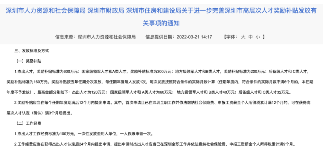 除了“真金白银”,东部高校还有地方政府各项人才引进政策的层层加持。以深圳市为例,经认定为杰出人才的高层次人才,可以获得为期5年、总额600万元的奖励补贴;其他各类人才的奖励补贴标准,均达到百万级别。