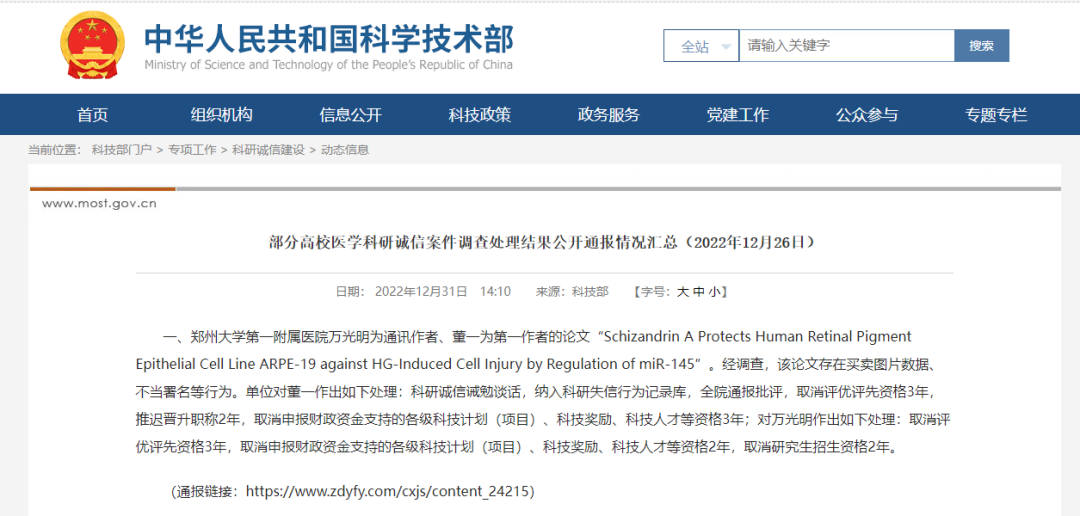 一、郑州大学第一附属医院万光明为通讯作者、董一为第一作者的论文“Schizandrin A Protects Human Retinal Pigment Epithelial Cell Line ARPE-19 against HG-Induced Cell Injury by Regulation of miR-145”。经调查,该论文存在买卖图片数据、不当署名等行为。单位对董一作出如下处理:科研诚信诫勉谈话,纳入科研失信行为记录库,全院通报批评,取消评优评先资格3年,推迟晋升职称2年,取消申报财政资金支持的各级科技计划(项目)、科技奖励、科技人才等资格3年;对万光明作出如下处理:取消评优评先资格3年,取消申报财政资金支持的各级科技计划(项目)、科技奖励、科技人才等资格2年,取消研究生招生资格2年。