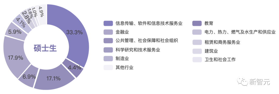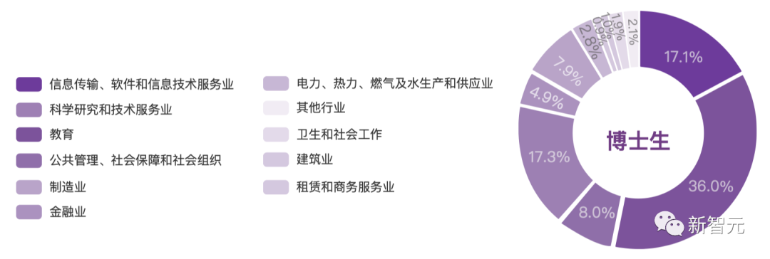而拿到了博士学位的毕业生,当然不能浪费这张多年苦读换来的文凭,从图中可见,有36%的博士毕业生,去向了教育行业。另外有17.3%,从事科研和技术行业。总体而言,去向排名前五的行业分别是教育(36%),科学研究和技术服务业(17.3%),信息传输、软件和信息技术服务业(17.1%),公共管理、社会保障和社会组织(8%),制造业(7.9%)。