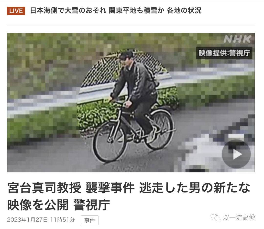 2023年1月27日,日本东京警视厅搜查1课公开了涉嫌实施袭击该教授的男子新图像,包括案发前骑着自行车的样子等。案发至今已近2个月。警方正在以杀人未遂嫌疑追查男子的行踪。