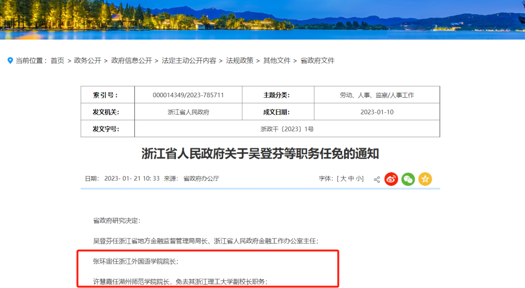 日前,浙江省政府官网公布《浙江省人民政府关于吴登芬等职务任免的通知》其中,任命张环宙任浙江外国语学院院长;许慧霞任湖州师范学院院长,免去其浙江理工大学副校长职务;免去洪岗的浙江外国语学院院长职务。