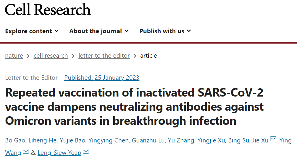 2023年1月25日,上海交通大学医学院上海市免疫学研究所叶菱秀团队联合上海市免疫学研究所王颖教授、上海交通大学医学院附属第九人民医院许洁主任医师,在 Cell Research 期刊发表了题为:Repeated vaccination of inactivated SARS-CoV-2 vaccine dampens neutralizing antibodies against Omicron variants in breakthrough infection 的研究论文。