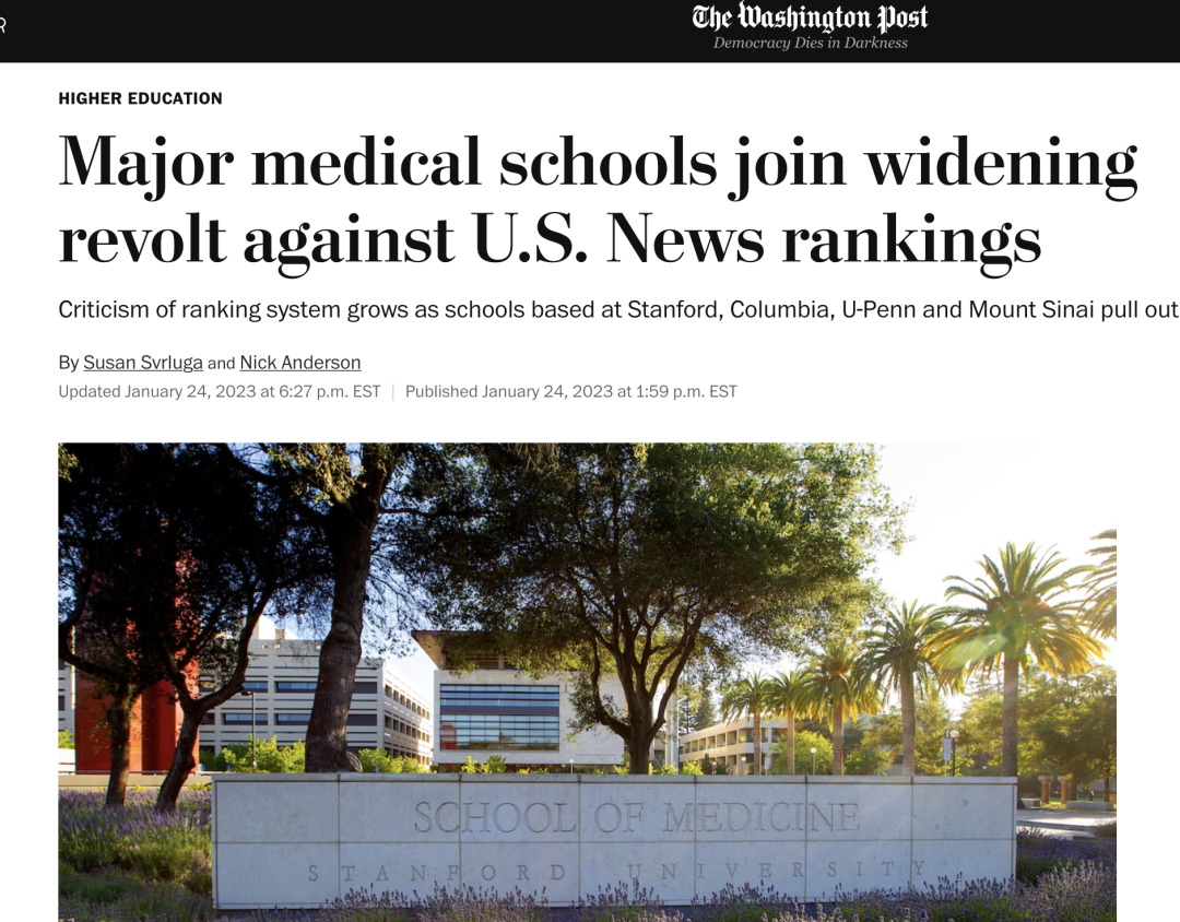 截至1月24日,已有哈佛医学院、斯坦福医学院、哥伦比亚大学医学院及宾夕法尼亚大学医学院、西奈山伊坎医学院等五所医学院退出U.S News大学排名。在 U.S. News 最佳研究医学院名单中,前10名中有四所就此退出排名。