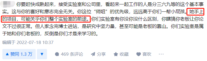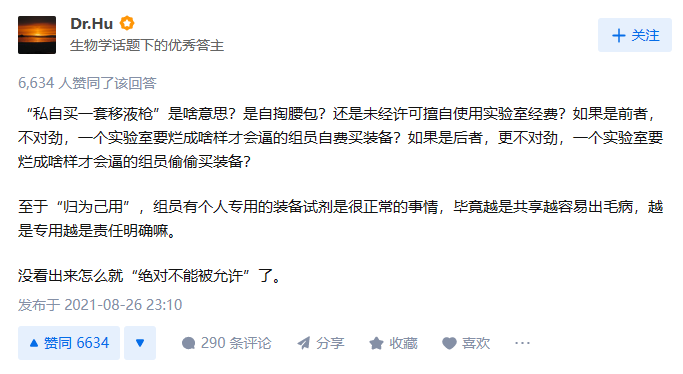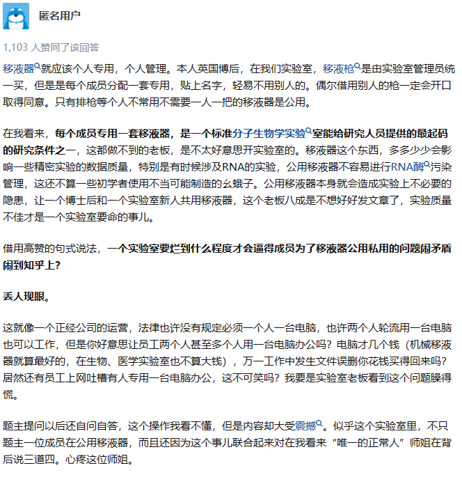 课题组成员,是我们朝夕相处的一群人,然而人与人之间频繁接触,难以避免滋生嫌隙......知乎就有这样一则话题,研究生提问,“实验室博士后师姐私自买一套移液枪并归为己用是对的吗?” 引发热议:她自己用实验室经费买的,发票还没开,所以大家一开始都不知道,是后来好几人都看到了她用新移液枪才知道的。实验室有公共实验用品放置区,移液枪差不多有两三套,有少部分不好用,但足以保证大家做实验够用。每人还各有一个专用的柜子,她放在自己柜子里,自己用,还写XXX专用的标签。因为是博后,没人敢说。首先清楚,博后是职工、是老师,难道是要“向上管理”吗?是学生物学魔怔了?如果研二进实验室没闯祸,很快就会有自己的专属移液枪了,至于没有的同学,还请努力。1. 发票还没开,意味着不能确定师姐用的是实验室公共经费,还是自己的博后的经费购买。就算她用实验室公共经费买的私用移液枪,那也是她和导师之间的事,你作为一个研究生无论如何也管不到博后的头上。2. “三套移液枪,有少部分不好用,但够用”,这么看来你们组是小还是寒碜?3. 自贴专用标签,对于这个我想说,我在中科院读研的时候也是这样的,因为我们全组做合成的都是如此。毕竟有些仪器非常娇贵,如果用的人多了维护起来非常麻烦,你说要是用着用着突然坏了那算谁的?但是私用就不会有这种纠纷。作为研究生,你只是看到并质疑博士后师姐私用移液枪这件事,但她手上的项目,可能关乎你们整个实验室的前途。人家念完博士进站,是研究中坚力量,甚至可能是老板的靠山。你们实验室是属于她和你们老板的,反倒是你们才是来学习的。也有博士表示可以理解,毕竟自己读博时经常为了移液枪吵架,自己解决问题的方式就是自己掏钱买:博二时实验室穷疯了,一咬牙自掏腰包4000块买了两把,自己用着很爽,用完就锁抽屉,毕业时候导师还让我发扬风格留下来,我直接带走,现在在家妈妈每个礼拜还给我擦一遍。这个话题也不禁触发了博士网友的回忆,课题组里偶尔会有一些人,他们的心态是这样的:和别人讨论课题,支支吾吾,遮遮掩掩,生怕自己的“诺奖创新”被别人窃取;夸他(她)发文章速度快,产量高,他(她)觉得别人影射他(她)灌水,工作质量不高;借实验笔记看,他(她)觉得别人怀疑他(她)造假;做出了好的工作,Paper发了,基金中了,奖项获了,别人夸奖几句,总觉得是妒忌自己……科研尚且艰难,还需要应付人际关系,确实是难上加难......抢一作、逼喝酒、干杂活……多少学生困在课题组烦扰的问题里,难以专注科研。2021年8月,一名南开大学的硕博连读生杨某被退学的事引发热议,其中他也提到了和课题组师兄的矛盾:师兄A因不会计算论文中的有些数据,去找导师帮忙。导师本来把这个任务安排给同组的B,但B推给了杨某。自己无论如何也无法将师兄的实验和数据对上,“他让我凑数据,我拒绝后,我们开始结仇。”两人之后又因琐事发生矛盾,杨某说,师兄用擀面杖(木棍)打了他的头。师兄却回应:杨某向我的qq邮箱里发了1600封攻击我亲人的邮件,我就决定聘请律师,和他对峙法庭。我就决定要彻彻底底地公开,虽然再三建议记者多做调查,请求记者深入了解内情。杨某当时搞破坏被拍到的画面:2017年1月份的一个早上,实验室多位同学找到A,给他看了几段视频,视频中杨某踢坏兰某开水壶、打开兰某电脑(A心大,一直没设置密码)、拿A抽屉里的零钱、最后用A抽屉里的水果刀怒划抽屉里的东西(期间B的自行车坐垫也被划碎),介于动刀的神情过于凶恶和其研一是和舍友打架出动过刀类武器,大家建议A报警。对此类现象,复旦大学环境科学与工程系教授马臻曾谈到:近年来网络媒体非常发达,“坏事传千里”。一些新媒体喜欢挖掘研究生师生等矛盾的个案,以增加阅读量。但我们应认识到:“个别真实”不代表“总体真实”,即一件事情是真的,也不能代表这样的事情很普遍。不得不说,科研已经很艰难了,其实大家都是一个课题组的,还是需要相互体谅。