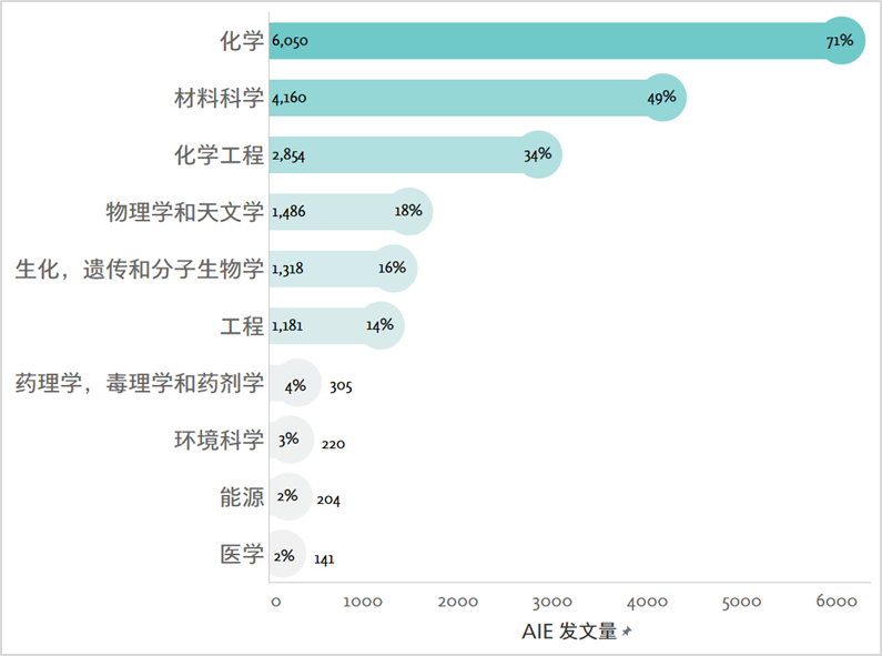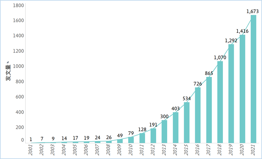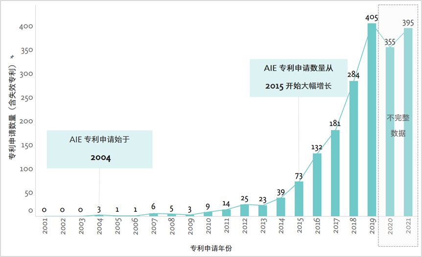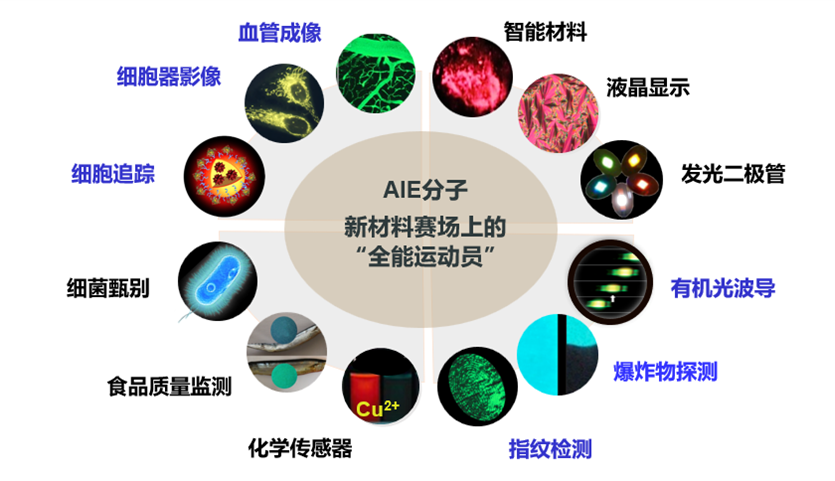 图1 AIE研究遍布全球(数据源于Scopus,截至于2021年12月31日)此外,基于唐本忠院士团队提出的、且受国际学术界普遍认可的分子内运动受限(restriction of intramolecular motion, RIM)工作机理,各式各样的AIE基元(AIEgens)被不断地开发出来。人们利用AIEgens在细胞示踪、血管成像、疾病诊疗、信息显示、智能材料、发光二极管、指纹检测、爆炸物探测、有机光波导、细菌甄别、食品质量监测、化学传感器等领域开展了大量的应用研究,揭示了AIEgens的巨大应用潜力(图2)。现在,AIE已经发展成为一个由我国科学家引领、国外科学家竞相跟进的全球热门研究主题,完成了从新概念到新领域的进阶,促进了研究哲学从还原论到整体论的范式转移和聚集体科学的平台构筑。由于AIE的学术原创性,国际引领性和巨大的产业化应用潜力,“聚焦诱导发光”项目荣获2017年度国家自然科学奖一等奖(图3),并获2018年度国家自然科学基金委员会“基础科学中心”项目资助。这份《AIE报告》主要包括:(1)AIE科研文献发展情况、(2)AIE在各个学科领域发展情况、(3)AIE从基础科研到产业转化之路等内容。自2001年以来,AIE领域相关发文量逐年增加。截止2021年底,全球已累计发表AIE相关SCI论文8843篇,年均复合增长率为44.9%。近十年(2012–2021)更呈现高速增长状态,发文数量占据已发表文章的95.8%(图4)。这种增长趋势仍在持续。仅2022年上半年,AIE相关论文便已经见刊1100多篇。在已检索的AIE论文库中,整体文章总引用次数大于304000次,均篇引用34.5次,并有4.6%的论文(410篇)位列全球1%高被引文献,32.56%的论文(2,883篇)位列全球10%高被引文献。以上数据说明AIE领域的科研产出普遍具有较高的科学价值和学术影响力,在科研界获得较高关注与认可。图4 AIE研究全球每年发文数量(2001–2021,基于Scopus数据库全库)目前,AIE材料已经广泛应用到诸多学科领域。《AIE报告》分析了在全球范围内AIE在各个学科领域发展的分布情况(图5)。化学、材料科学、化学工程学是全球AIE科研文献数量分布最多的学科领域,其次是物理学、天文学、生化、遗传和分子生物学、工程学。随着AIE在全球范围内影响力的提升,在药理学、毒理学、药剂学、环境科学、能源、医学等学科的研究热度也在逐步上升。图5 2012–2021年期间全球AIE发文量前十的ASJC学科以及学科发文量占比2011–2021年期间,全球AIE科研在多个热门行业方向的发文量均有不同程度的增长,说明AIE科研不仅在全球多个科研前沿方向产出活跃,同时也带动了AIE在不同行业的发展。图6 全球AIE专利申请情况(检索时间:2022/7/21;数据源:LexisNexis®PatentSight®)注:近两年的专利数量由于专利申请公开延迟导致数据相对滞后,因此图中专利申请数据大幅小于实际数据。从专利所属的技术领域来看,当前AIE专利主要分布在化学、信息技术、医疗健康、电子等技术领域(图6)。随着AIE技术的不断发展和成熟,AIE专利成果不断增加,在2015年后进入快速增长期。经统计,AIE相关有效专利达1,600多件,其中中国专利占比92%,我国也成为了AIE产业的创新高地。值得一提的是,为了将我国原创性、引领性科技成果导入市场,推动AIE技术转化研究和产业化落地,在广州市科技局、广州高新技术产业开发区管委会和华南理工大学三方的共同支持下,专职从事AIE的产学研推进工作的广东省大湾区华南理工大学聚集诱导发光高等研究院(以下简称AIE研究院)于2020年5月正式建立。短短两年时间,AIE研究院完成了科研耗材、功能微球、体外诊断、公共安全、光电转化、功能材料六个研发中心以及公共仪器测试平台的建设,并获得了广东省新型研发机构资质认定和专利快速预审通道机构认定,包括荧光探针、功能微球、毒品快检试剂盒在内的多款产品已推向市场。此外,AIE研究院联合华南理工大学与国际权威科学出版社Wiley创立了Aggregate(《聚集体》)期刊。该刊运行良好,于2021年获广东省高水平期刊项目资助,被全球最大的开放获取期刊DOAJ数据库和科睿唯安(Clarivate)的Web of Science核心合集ESCI收录,在2022年科睿唯安发布的期刊引证报告(JCR)中位列三个学科的一区(Q1)。2023年,Aggregate将获得首个影响因子,目前即时影响因子已超过17.5。二十年来,AIE研究发展迅速、成果丰硕。这份《AIE报告》是一部AIE研究的二十年征程巡礼,它从科研覆盖领域的广泛性、先进性和交叉性进行分析,从数字上客观展现了AIE研究从量到质的蜕变与跃迁。这份《AIE报告》不仅对一线科研人员和领导决策层有参考价值,而且对AIE研究向产业转化的战略布局有指导意义。(1)AIE是一个由中国科学家开创并引领、国外科学家竞相跟进的新兴科研领域。该领域正在高速发展,并产生世界范围的科研影响力。(2)AIE理论和应用研究横跨化学、材料、光学、物理、生物、医学等多个学科领域。在快速发展和交叉创新进程中,AIE研究不断向多学科多领域扩展,在光电器件、化学传感、健康医疗、智能响应等领域体现出巨大的应用潜能。(3)鉴于AIE在有机光电和生物医疗方面的广泛应用,产学合作,成果转化以及相应材料和器件产业化将是未来的主要发展方向。