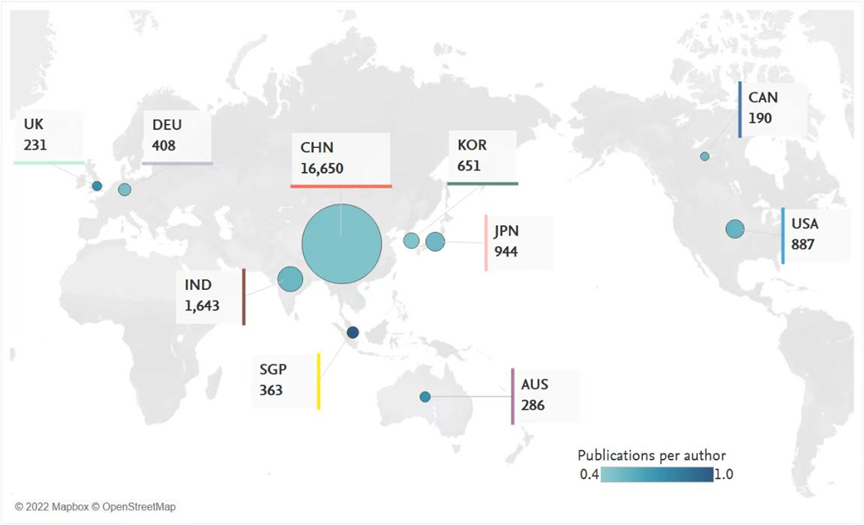 聚集诱导发光(aggregation-induced emission, AIE)是一个由中国科学院院士唐本忠教授于2001年提出的新科学概念。具有AIE效应的材料,在分散态下发光微弱甚至不发光,聚集后发光显著增强,呈现出颠覆传统认知的光物理现象。AIE是我国科学家开拓的一个新领域,已经成为了化学、材料等领域的一个研究热点。为了系统地展示AIE科研领域的发展历程及最新研究动态,建立全面客观的AIE知识库,推动以AIE为技术基础的产业创新与发展,国际权威科学出版社爱思唯尔(Elsevier)最近推出了《聚集诱导发光(AIE)2001–2021科研发展与影响力报告》(以下简称《AIE报告》)。爱思唯尔是一家国际驰名的信息和解析公司,是世界上科学、技术和医学信息的主要提供者之一。爱思唯尔科研分析团队借助其大型文献数据库,梳理了全球范围内AIE研究领域相关专家学者、科研产出,分析解读了AIE科学研究、技术研发与产业发展趋势,通过详实的数据统计和直观的可视化图表呈现了一份高价值前沿报告(点击“阅读原文”可免费获取报告)。有机发光材料在光电器件、化学传感、生物探针、医学诊疗等众多领域有广泛的应用。然而,这些应用通常要求发光材料以微粒、胶束、薄膜、粉末等固态或聚集体形式存在。有机发光材料常因其聚集导致发光猝灭(aggregation-caused quenching, ACQ)效应,大大降低发光效率,从而限制其实际应用与技术发展。AIE概念的提出颠覆了ACQ的传统认知,打破了传统有机发光材料开发应用的一大桎梏,为高效发光材料的设计提供了一条新思路,构筑了一个发展固体发光材料的新平台。自AIE概念提出,以唐本忠院士团队为核心的科研人员在AIE领域开展了大量的研究工作,纵向深究工作机理、发展设计理念,横向丰富AIE材料、拓展应用领域。过去20年是AIE研究的快速发展期,我国原创的AIE科技现已得到国际上化学、材料、生物、医学等领域的科学家和产业界人士的广泛关注。2001–2021年间,全世界约有76个国家/地区、2200余家科研机构、23900多名科研工作者从事AIE以及相关领域的研究工作(图1)。