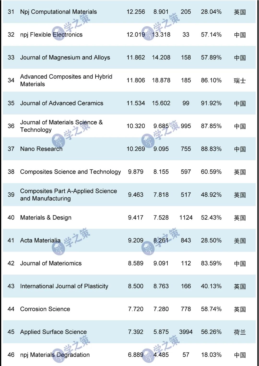 即时IF方面,目前仅有10本已经追平去年,例如Nature Reviews Materials、Nano-Micro Letters、Advanced Fiber Materials等。涨幅较大的有Advanced Composites and Hybrid Materials、Journal of Advanced Ceramics和Rare Metals。但今年总的来看,IF会呈下行趋势。