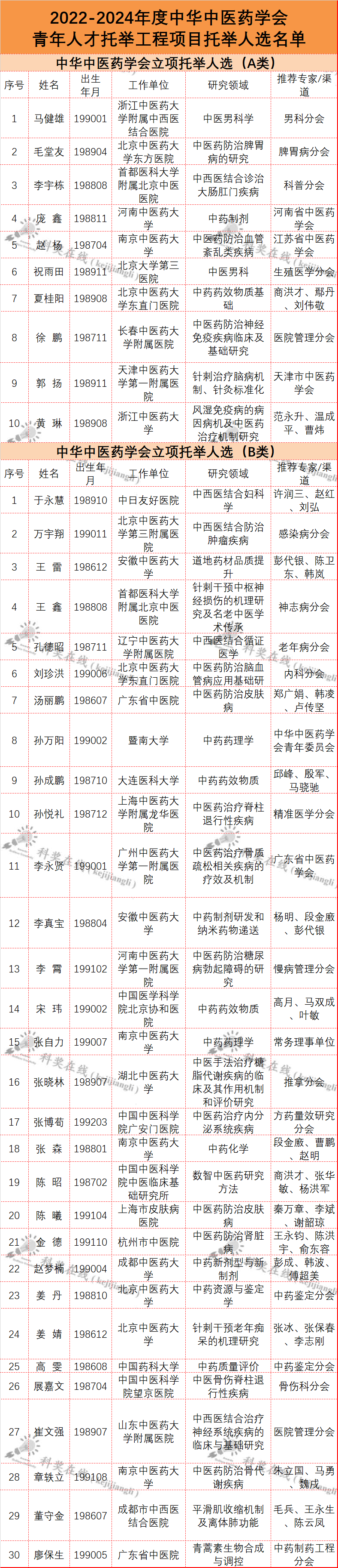 2022-2024年度中华中医药学会 青年人才托举工程托举人选