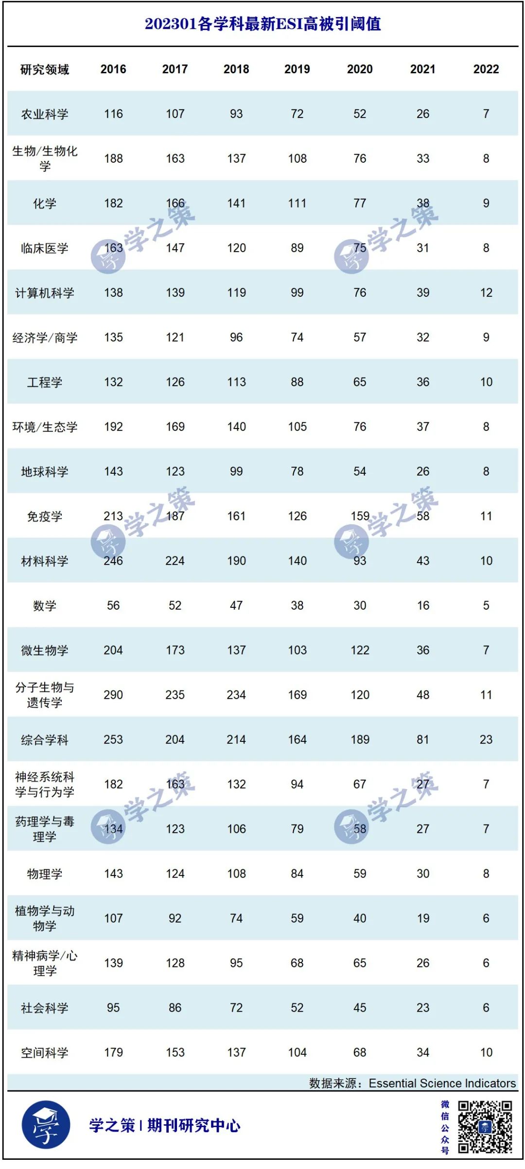 注:ESI的更新时间为每奇数月的第二个星期四。下面是各领域最新阈值。
