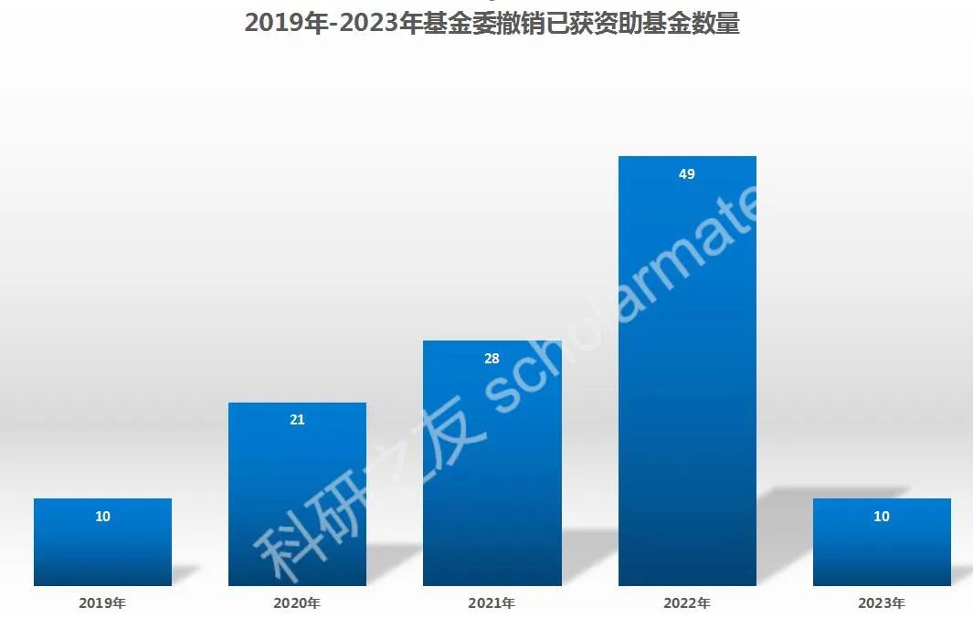 2019年-2023年这五年间基金委共发布通报批评决定处理书155份,撤销已获资助项目118项,处理相关人员165人以及两个失责单位。