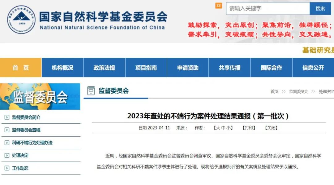 2023年4月11日,国自然发布了2023年查处的不端行为案件处理结果通报(第一批次)。
