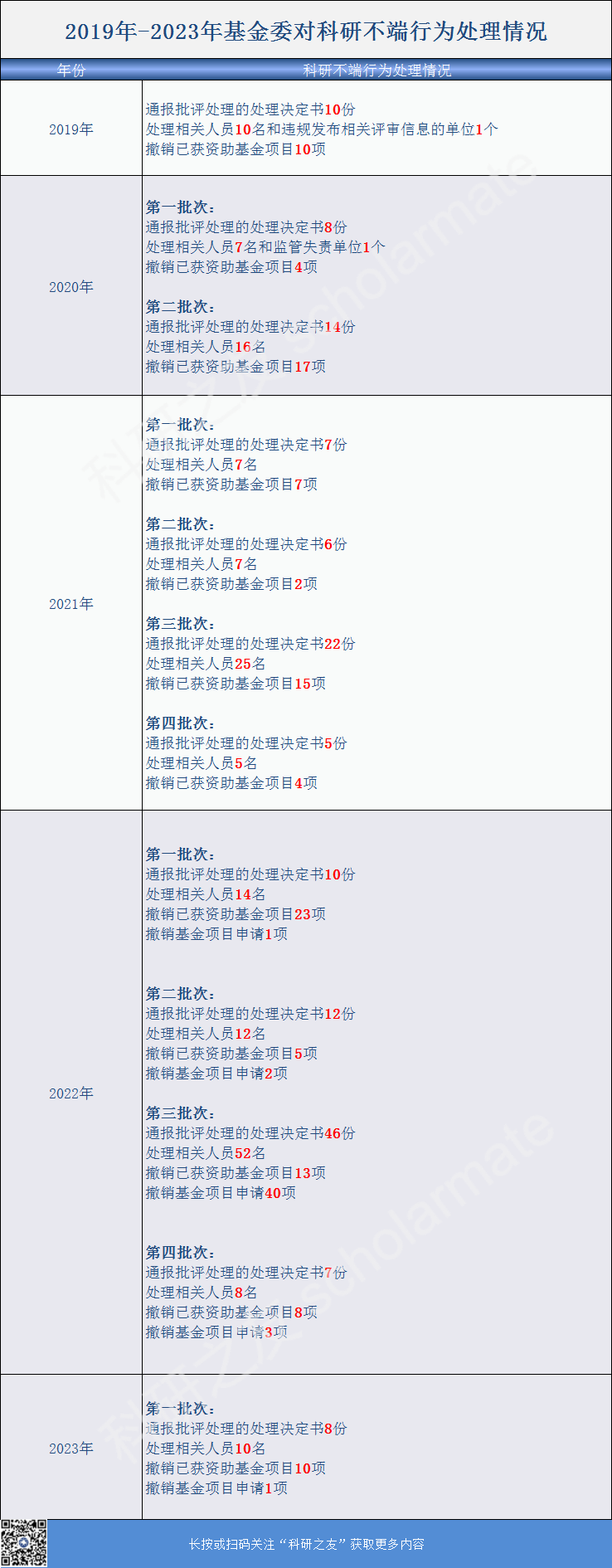 以下为小编整理的2019年-2023年基金委对科研不端行为的处理情况表和统计表。