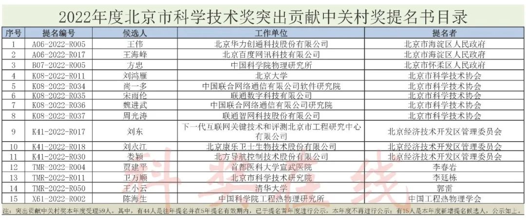 2022年度北京市科学技术奖提名工作已经结束,共收到提名书948份,其中人物奖(含突出贡献中关村奖、杰出青年中关村奖、国际合作中关村奖)提名书170份,项目奖(含自然科学奖、技术发明奖、科学技术进步奖)提名书778份。现将收到的提名书目录在“北京市科委、中关村管委会网站”公布(网址。人物奖公示内容包括提名者、候选人及其工作单位;项目奖公示内容包括项目名称、提名者、提名奖种、提名等级、候选人及排序、候选单位及排序、主要支撑材料目录。查询主要支撑材料目录请联系北京市科学技术奖励工作办公室。公示时间为2023年5月5日—2023年5月12日(7个工作日)。