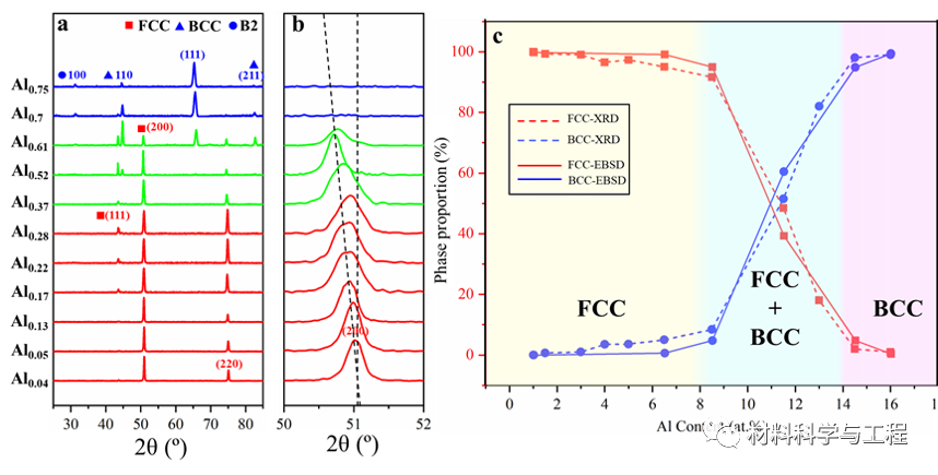 图4(a)沿GD的梯度AlxCoCrFeNi HEAs的相变化、(b)取向图和(c)代表性区域的极图。图4EBSD结果显示FCC/BCC相位比例统计结果与Maud拟合结果具有一致性。双相区由细小的类等轴晶组成,晶粒形态受相成分影响,织构取向相对于单相区明显变弱。