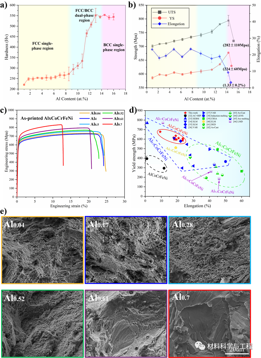 图6(a)AlxCoCrFeNi合金的硬度和(b)机械性能与Al摩尔比的关系;(c)代表性工程应力-应变图(d)本研究和文献中报道的样品的屈服强度-断裂伸长率比照;(e)图(c)中拉伸样品的断裂表面图6的机械性能表征结果显示与其他单相高熵合金相比,双相合金Al0.61展现出优异的强度和延展性组合,YS在635Mpa左右,UTS在 750Mpa左右,伸长率在20%左右,归因于独特的FCC/BCC分层双相结构所带来的背应力强化作用。在打印态Al0.7合金断口中观察到的解离花样表明过高的Al成分会严重恶化其性能。综上所述,在这项研究中,利用自主开发的激光粉末床熔合 (LPBF) 系统制造成分梯度的 AlxCoCrFeNi (x = 0.04–0.75) HEAs。基于拉伸性能表征确定了打印态AlxCoCrFeNi HEAs中Al的极限含量:当x达到0.7及以上时才会产生严重的热开裂现象,激光打印过程中Al微量化学偏析有助于抑制热裂纹的形成和扩展;同时基于强塑性的权衡我们认为当Al成分范围在到0.52-0.61之间时会使打印态AlxCoCrFeNi合金获得独特的双相分层式微观结构从而保持良好的强度和延展性。此项研究为今后利用激光增材制造制备特定成分的高性能高熵合金构件提供了成分选择的空间和实践路径。