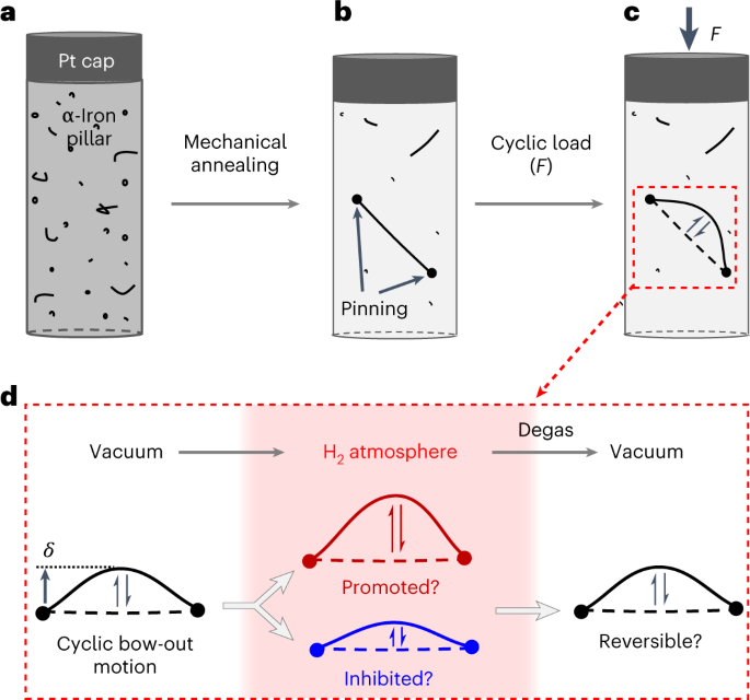 图1 揭示氢对位错运动影响的实验装置示意图。a、预制的单晶微柱,顶部有铂盖,提供良好控制的接触条件。b、经过机械退火处理的微柱,消除了大部分原有的位错,同时保留了几个两端固定的长螺型位错。c、在循环压缩荷载(F)作用下,工程应力在最小(σmin) ~最大(σmax)范围内,钉点间的位错段相应向前、向后移动。虚线表示它们在σmin处的形状和位置。d,在不同的测试气氛(真空,氢气)下进行连续循环压缩实验。© 2022 Springer Nature