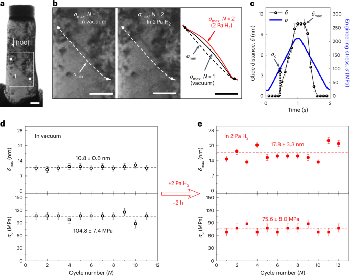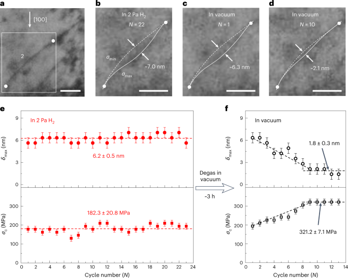 图3 氢脱气对位错行为的影响。a,在σmin (~35 MPa)下移动位错2。位错2的可移动段位于b-d中放大观察到的框状区域,其中其轮廓用白色虚线勾画,作为参考位置和形状。b - d,在(N = 22 (b))之前和(N = 1 (c)和10 (d))切换回真空后所选几个周期的位错运动。位错2在σmax (~355 MPa)处的分布以白色实线描绘。在2 Pa H2 (e)和真空(f)中,位错2的δmax和σc的测量误差分别为±0.7 nm和±15.9 MPa。误差条表示标准差。样品在真空中脱气约3小时后开始真空试验。© 2022 Springer Nature