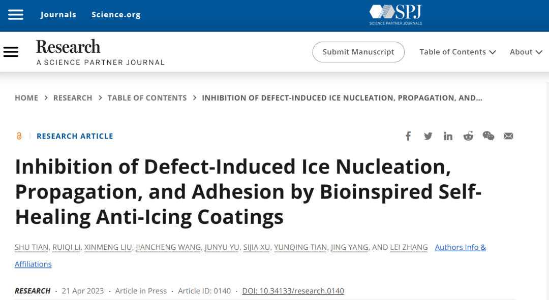 用于户外基础设施表面的防冰涂层在露天场景下不可避免受到如冰雹、沙尘暴、高空异物等撞击,导致表面发生严重的机械损伤,降低防冰涂层的使用寿命。同时机械损伤对于涂层的防/除冰性能的可能产生的负面影响也缺乏深入的研究讨论。如何理解并克服机械损伤对于防冰涂层的影响是防冰领域面临的关键难题。开发具有自主愈合能力、克服机械损伤,能够实现户外长效防除冰的新型防冰涂料对于实际应用具有重要意义。天津大学化工学院张雷、杨静团队长期从事自愈合、防冰抗冻材料的研究,团队开发的基于多重动态键的“全天候”自愈合材料首次实现了在低温、水下、强酸/碱等极端环境的自主自愈合(Nat. Commun. 2020, 11, 2037),之后团队将该材料与氟化石墨烯结合,制备出自愈合光热防冰涂层(Small 2023, 19, 2206075)应用于实际防/除冰工作。① 天大团队首次揭示机械损伤对涂料防/除冰性能的影响机制近日,天津大学化工学院张雷、杨静团队在Science合作期刊《Research》(IF=11.036)上发表了题为“Inhibition of Defect-Induced Ice Nucleation, Propagation, and Adhesion by Bioinspired Self-Healing Anti-Icing Coatings”的研究论文。首次系统地揭示了涂料表面机械损伤对涂料防除冰性能的影响机制,并提供了一种在低温下可自主自愈合的仿生防冰涂料。天津大学化工学院博士研究生田澍为论文的第一作者,张雷教授和杨静副教授为通讯作者,天津大学化工学院为第一单位,合作单位为滨州魏桥国科高等技术研究院。该研究得到了国家自然科学基金的支持。该工作首先通过实验配合理论计算,探究了涂料损伤缺陷处的结冰过程。通过高速摄像观察到,低温下缺陷处优先产生冰晶进而扩散至整个水滴完全结冰。已冻结的水滴会以缺陷为“桥梁”,向邻近水滴进行冰晶的扩散传递,最终使相邻水滴冻结。通过第一性原理和有限元计算发现,涂料缺陷处与水分子的吸附能力更强、传热速度更快,因此冷凝水更容易在缺陷处成核结冰。另外,缺陷处结冰后会与冰形成嵌入式“互锁结构”,增加了冰在涂料表面的粘附强度和除冰难度。缺陷诱导冰成核、传递、粘附的过程如图1所示。值得注意的是钢板表面冰成核温度是-13.6℃,而损伤后涂料表面冰成核温度为-9.5℃,说明损伤使涂料从“防结冰”变为“促结冰”。图1 缺陷诱导涂料表面冰成核、扩散传递以及冰粘附行为和机制该团队研究挖掘了天然抗冻蛋白的关键抗冻模块(冰结合位点IBS与非冰结合位点NIBS),通过模拟IBS与NIBS抗冻模块,构建了仿抗冻蛋白聚合物PDSB,并加入到自愈合材料基质中,制备了兼具优异防结冰和易除冰性能的自愈合防冰涂料。该防冰涂料通过PDSB的“NIBS”模拟模块结合水分子,降低表面冰非均相成核温度,通过“IBS”模拟模块抑制冰晶扩散传递,提高了涂料的防结冰性能。结果表明,与钢板相比,该涂料的冰成核温度降低了-15.8℃、结冰延迟了48.4倍、冰扩散速度下降两个数量级。此外,涂料通过低表面能结构以及两性离子SB链段与界面水分子形成的不冻结水,降低了涂料的冰粘附强度,提高了涂料的除冰性能,冰粘附强度仅为空白钢板的1/23(图3)。④ 多重动态键实现涂料低温下自主自愈合及户外长期使用该涂料通过材料分子结构中的强氢键、弱氢键、二硫键以及静电相互作用实现优异的低温自愈合性能,表面损伤缺陷在-20℃下可实现自主愈合,愈合后的力学性能、防结冰性能(成核温度、结冰延迟时间)以及除冰性能(冰粘附强度)均得到良好的恢复,从而有效抑制缺陷诱导的冰成核、传递和冰粘附。该工作与目前国际上已报道的防冰涂料相比,不仅可以在低温下自主愈合,还可以同时抑制冰成核、传递和粘附,具有环境适应性和大规模涂装潜力,为应用于户外易损伤环境下防冰涂料的研发提供了新思路(图4)。图4 仿生自愈合防冰涂料-20℃下的自愈合性能及同已报道的防冰涂料性能对比张雷,天津大学化工学院生物化工系教授、系主任、博士生导师,国家自然科学基金优秀青年基金获得者。主要研究方向包括生物化工与合成生物学、低温保护、功能材料、防冰涂料等。已在Nature Biotechnology, Nature Communications, JACS, Angew, Chemical Reviews, AIChE Journal, CES, Research, Engineering等期刊发表论文100多篇。杨静,天津大学化工学院副教授、博士生导师。主持国家级重点项目、国家自然科学基金、天津市基金、教育部博士后基金等项目。主要研究方向为细胞保存、仿皮肤材料、合成生物学等。已在Nature Communications, Research, Advanced Functional Materials, Chemical Reviews, AIChE Journal等刊物发表第一作者/通讯作者SCI论文40余篇。田澍,天津大学化工学院博士研究生。主要研究方向为功能防护涂料开发与应用。目前以第一作者/共同第一作者身份在Research, Small, CES, Chemical Engineering Journal, Biosensors & Bioelectronics, ACS Sustainable Chemical & Engineering, ACS Applied Materials & Interfaces等期刊发表论文10余篇。