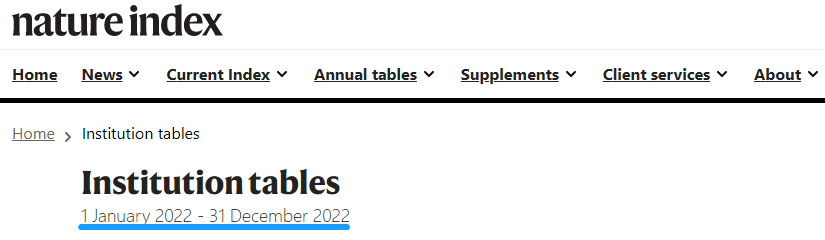 自然指数(Nature Index)于2014年11月首次发布,是依托于全球顶级期刊(《自然》系列、《科学》《细胞》等82种自然科学类期刊),统计各高校、科研院所(国家)在国际上最具影响力的研究型学术期刊上发表论文数量的数据库。运用这个数据库,可以根据各机构的论文发表数量及类别来进行排名和期刊索引。目前,自然指数已发展成为国际公认的能够衡量机构、国家和地区在自然科学领域的高质量研究产出与合作情况的重要指标,在全球范围内有较大影响力。