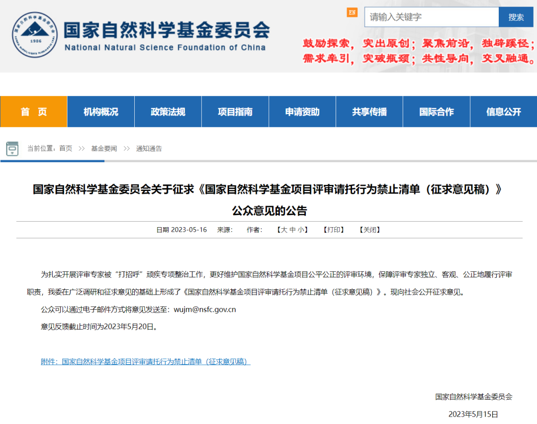 5月16日,国家自然科学基金委员会网站公告征求《国家自然科学基金项目评审请托行为禁止清单(征求意见稿)》公众意见。意见稿分别对科研人员、依托单位、评审专家、自然科学基金委工作人员等列出禁止行为清单。意见反馈截止时间为2023年5月20日,意见稿全文如下: