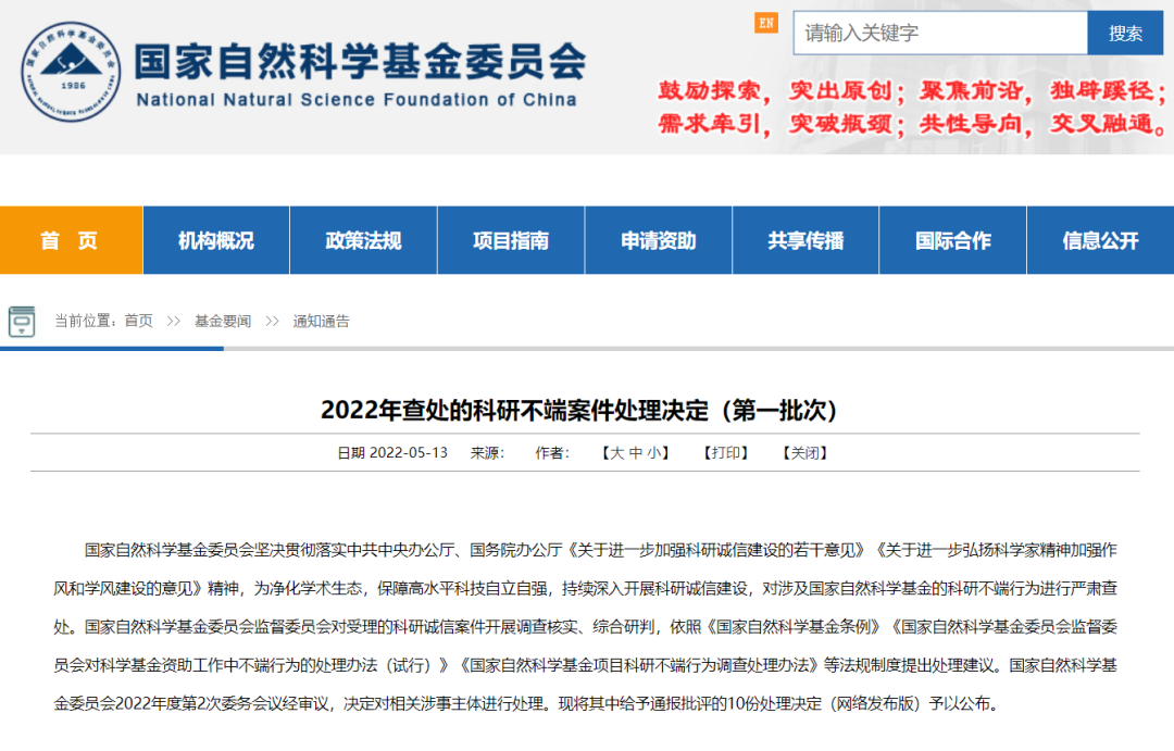 经国家自然科学基金委员会监督委员会五届十二次会议(生命医学专业委员会)审议、国家自然科学基金委员会2022年第2次委务会议审定,决定依照《国家自然科学基金条例》第三十五条第四项、《国家自然科学基金委员会监督委员会对科学基金工作中不端行为的处理办法(试行)》第十七条第三、四项、第九条撤销吴冬梅国家自然科学基金项目“TRPV4介导软骨藻酸处理致小鼠认知缺陷的分子机制”(批准号81400902),追回已拨资金,永久取消吴冬梅国家自然科学基金项目申请资格(自2022年1月18日起),给予吴冬梅通报批评;决定依照《国家自然科学基金条例》第三十五条第四项,并参照《国家自然科学基金委员会监督委员会对科学基金工作中不端行为的处理办法(试行)》第十七条第三、四项,撤销郑元林国家自然科学基金项目“HDAC6激活HMGB1/RAGE信号轴介导Ⅱ型糖尿病小鼠认知缺陷的机制研究”(批准号81571055),追回已拨资金,取消郑元林国家自然科学基金项目申请资格5年(2022年1月18日至2027年1月17日),给予郑元林通报批评;决定参照《国家自然科学基金委员会监督委员会对科学基金工作中不端行为的处理办法(试行)》第十七条第三、四项,取消陆军国家自然科学基金项目申请资格5年(2022年1月18日至2027年1月17日),给予陆军通报批评。