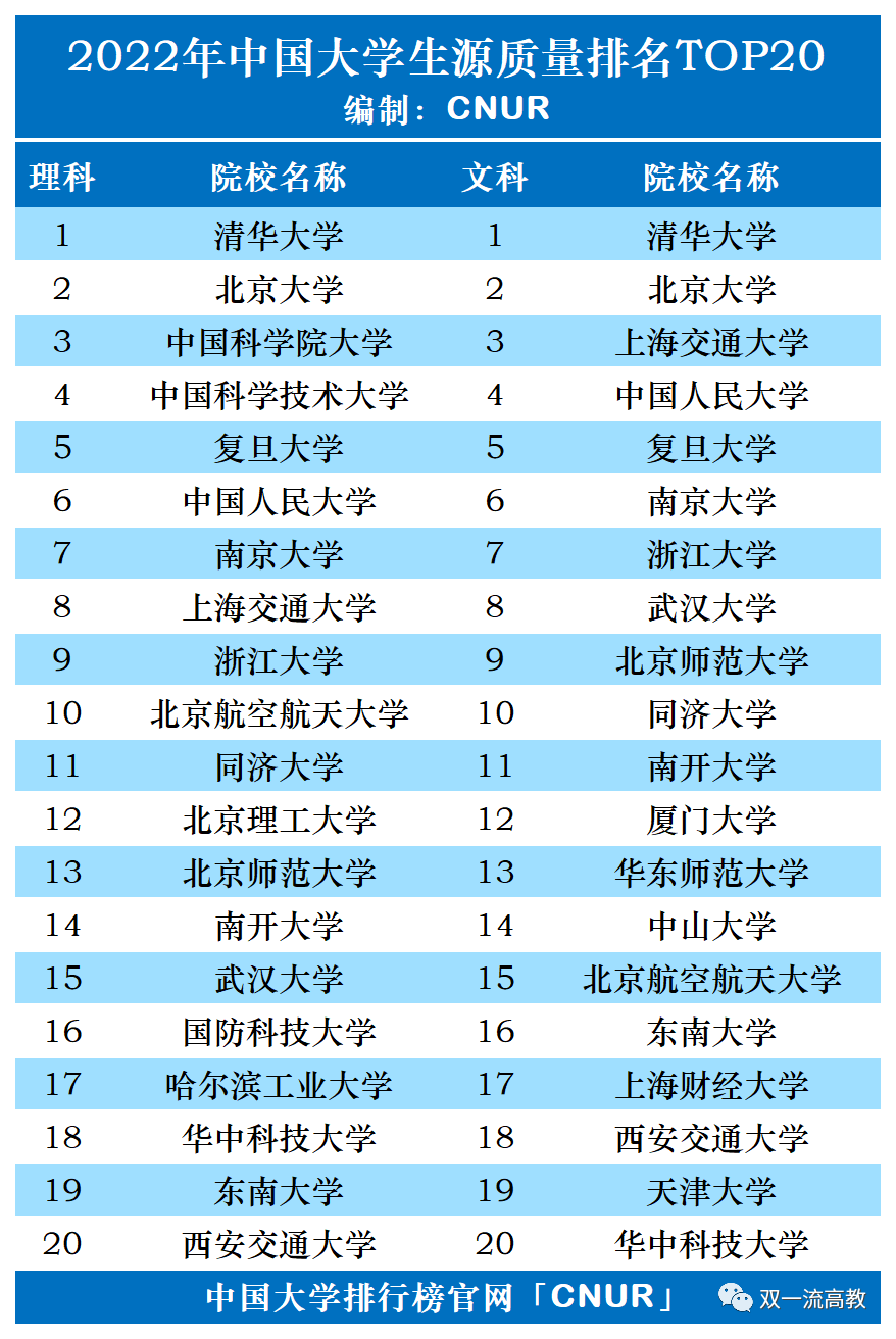 2022年中国大学生源质量排名发布:其中理工/物理/综合排名前十的院校分别为清华大学、北京大学、中国科学院大学、中国科学技术大学、复旦大学、中国人民大学、南京大学、上海交通大学、浙江大学 ; 文史/历史排名前十的院校分别为清华大学、北京大学、上海交通大学、中国人民大学、复旦大学、南京大学、浙江大学、武汉大学、北京师范大学以及同济大学。