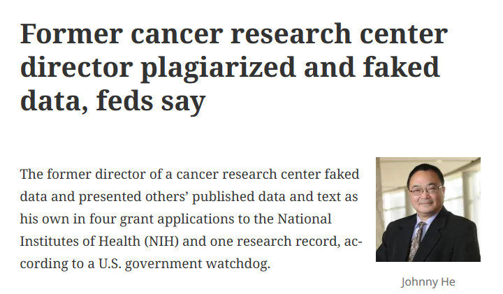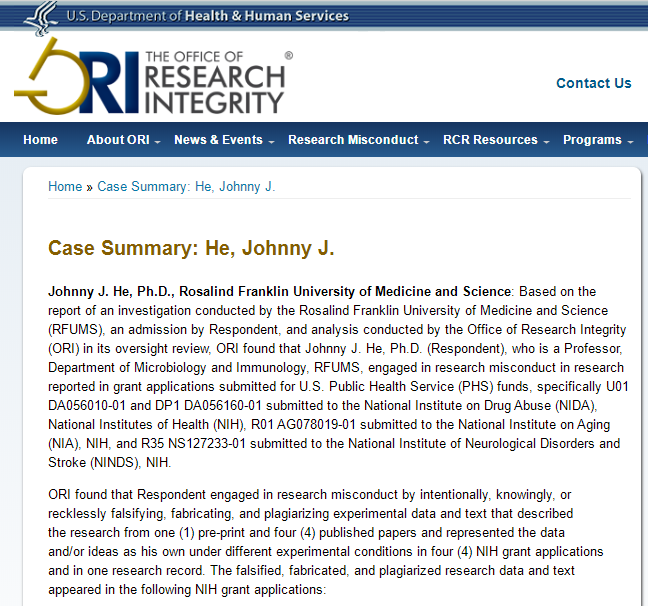 根据美国政府监管机构通报:罗莎琳德富兰克林医科大学 (Rosalind Franklin University of Medicine and Science,RFUMS)癌症细胞生物学、免疫学和感染中心的前主任何江林(Johnny J. He)教授在向美国国立卫生研究院(NIH)提交的四项基金申请和一项研究记录中伪造数据,并将他人发表的数据和文本作为自己的数据。