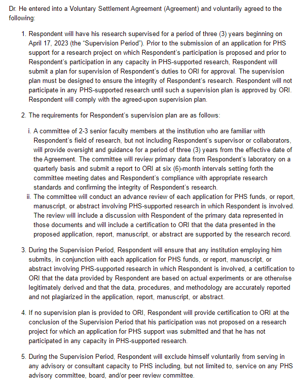最后他与ORI签订了自愿和解协议:从2023年4月17日开始,他将接受为期三年的监督。在ORI批准监督计划之前,他不得参与任何PHS支持的研究。在监督期间,被申请人将自愿退出PHS的任何咨询或顾问职位,不得在包括NIH在内的美国公共卫生服务机构的任何咨询委员会、董事会或同行评审委员会任职。