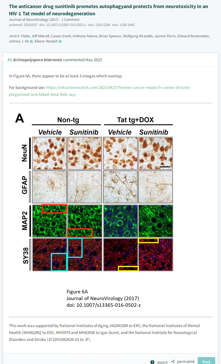 科研诚信办公室发现他从其他研究人员发表的论文中获取数据,并用它们来代表他自己在NIH基金申请中的数据,有时会裁剪和拼接图像,同时表示他还抄袭了发表过的文章。所有抄袭和伪造数据的资助申请都没有得到资助。确实,在pubpeer上也能搜到网友对他论文中的数据图像表示怀疑的信息。
