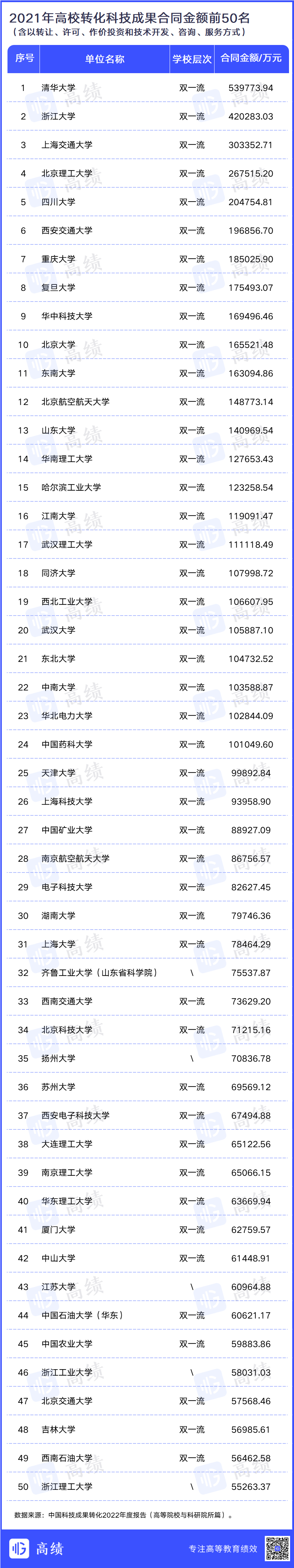 2021年,高等院校以转让、许可、作价投资和技术开发、咨询、服务方式转化科技成果合同金额排行中,清华大学以539773.94万元位列第一位;浙江大学紧随其后,以420283.03万元,位列第二位;上海交通大学以303352.71万元位列第三位;北京理工大学以267515.2万元位列第四位;四川大学以204754.81万元位列第五位。这5所高校科技成果转化合同金额都超过了20亿,科技成果转化水平领跑全国。