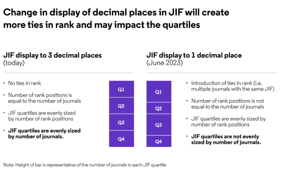 也就是说,由于JIF只保留一位小数,SCI/SSCI期刊将出现更多的并列排名,这会使得各个分区的期刊数量可能不一样,将看到一些四分位数将包含比往年更多或更少的期刊数量。