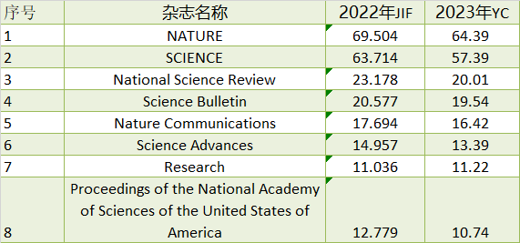 根据中国科学院分区表可知,共有8本综合类的1区杂志,Nature 及Science 影响因子还是保持高位,都超过了55;Research 是2018年开始出版,最新的影响因子预测略有上升。由于Nature Communications ,PNAS 及Science Advances 发表的文章数量较多,影响因子变化不是很大。