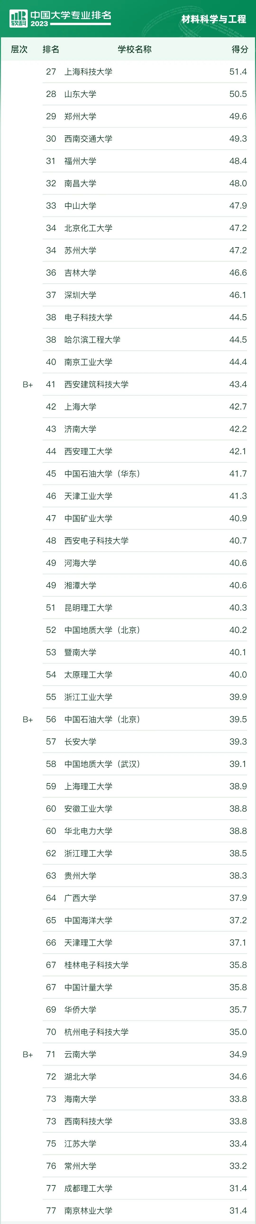 “学校条件”考察一所大学的经费收入、师资规模、师资结构、教授授课等学校层面的培养条件,结果用于学校开设的所有专业; “学科支撑”考察专业关联学科的水平和实力,一个学科对与其关联密切的专业均有支撑作用; “专业生源”即专业录取新生的高考成绩,反映了该专业的社会声誉和对学生的吸引力; “专业就业”体现了专业的毕业生被社会认可和接纳的情况; “专业条件”考察本专业的模范师生、思政教育、一流课程、优秀教材、教学成果、教改项目、平台基地等专业层面的培养条件以及本专业获得的各种认证和重点建设情况。 材料科学与工程专业排名结果如下: