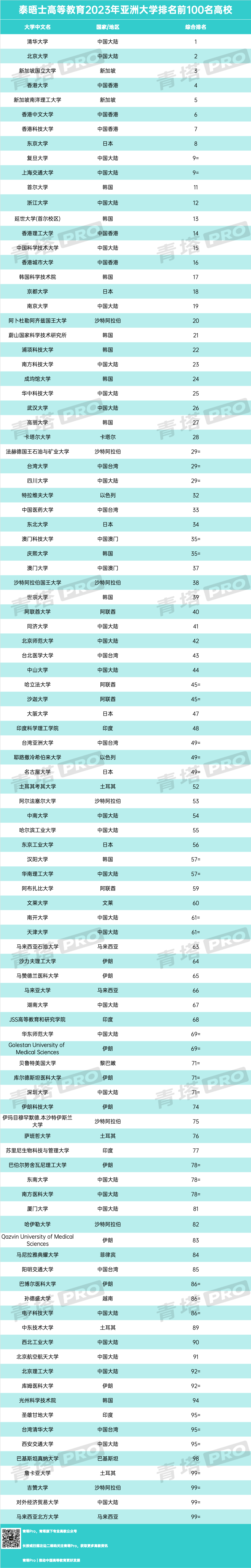 2023泰晤士亚洲大学前100名高校如下: