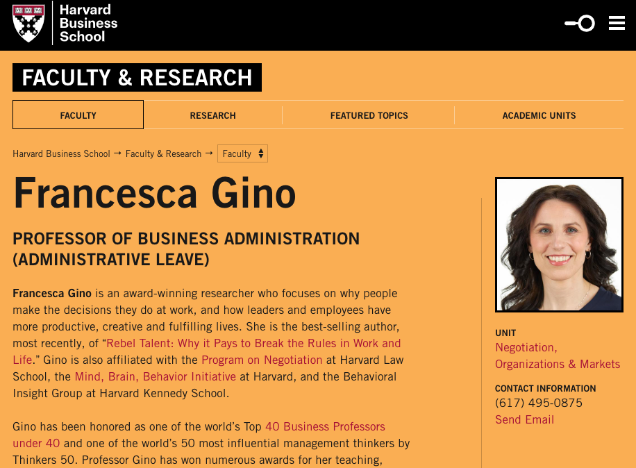 据《科学》新闻 (Science news) 报道,美国哈佛大学商学院工商管理教授 Francesca Gino被指在多篇论文中伪造数据,包括其在 2012 年发表于《美国科学院院刊》 (PANS) 上的一篇有关不诚实研究的论文。这篇论文早在 2021 年被发现存在数据造假问题,随后因另一合作研究者明显伪造数据而被撤稿。
