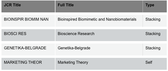 6 月 28 日,科睿唯安发布 2023 期刊征引报告(JCR),其中 4 种期刊因引文模式异常被撤销了影响因子,不包含中国期刊。其中,由 SAGE 出版的商学期刊 Marketing Theory 被认定为自引比例过高。余下三本遗传学/生物学期刊——塞尔维亚遗传学会出版的 Genetika,巴基斯坦出版商 ISISnet 出版的 Bioscience Research,以及英国 ICE Publishing 出版的 Bioinspired, Biomimetic, and Nanobiomaterials 则被判定为存在引用堆叠现象。