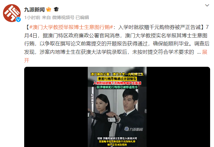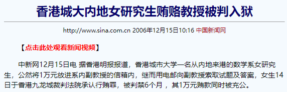 读博第三年,写不完论文开题报告,想通过贿赂导师让自己顺利毕业?这样震惊的操作,电视剧可能都不好意思这么演,现实却发生了......7月4日,据澳门特区政府廉政公署官网消息,澳门大学教授实名举报其博士生意图行贿,以争取在撰写论文前开题报告能获得通过,确保能顺利毕业。澳门廉署称其涉嫌触犯澳门《刑法典》中的行贿罪,案件已移送检察院处理。涉案的这位内地博士生,在澳大法学院读博,按校方规定,如果他未在入学第3年结束前完成开题报告,会被勒令退学。在限期届满前,该生的指导教授在个人信箱内,发现自己送给博士生的书里面夹有装着一沓现金的红色信封,随即联系校方行政人员一同约见该博士生,该博士生承认这些现金是打算给予指导教授。据悉,过去该博士生也曾在入读澳大后,想要送指导教授数千元的购物礼券,但被严正告诫及拒绝。网友:意图行贿导师这件事,看来是“早有前科”、屡教不改啊...2006年12月15日,一名湖北籍学生陈静,入读香港城市大学数学系哲学博士,在数学系课程准备举行期末考的时候,她准备了一个装有1万元现金的信封,放到了该系副教授戴晖辉的城大邮箱里。同日戴晖辉收到了一封匿名电邮 ,对方(后证实是被告)声称是该课程的学生,亦是将现金放入邮箱的人。5日后,戴再收到被告寄给他两封电邮,催促他将试题及答案交予她。戴晖辉出生于内地,1984年浙江大学力学系毕业后赴英国、加拿大留学,1995年进香港城市大学任教,数学系副教授,专长应用数学及计算数学等。收到钱和匿名电邮后,戴晖辉与系主任周定轩商量,随后向校方高层汇报,校长张信刚等高层认为事态严重,决定向廉署举报。“我是第一时间向学校汇报,没有过一分钟犹豫。”戴晖辉说,“匿名送钱和用匿名电邮索要试题和答案,在香港已构成犯罪事实。若认同这一前提,我所做的,就是再正常不过。”其后,戴在廉署指示下,相约被告在咖啡店见面,表示会让被告查看有关试题及答案。而被告更要求戴带备空白的答题簿,让她抄下答案。被告赴会并确认自己是撰写匿名电邮的人。戴随即把预先准备的试题、答案、两本空白答题簿交给被告,正当被告在埋头抄写答案时,即被廉署人员拘捕。12月14日,陈静被送到法院审判,法官判其立即入狱6个月,1万元贿款同时被充公。陈静的博士生同学在校园一个论坛上回忆:“一次聊天时,她说自己一直以来——从小学到大学一直不停上学到博士——在自己的圈子里是非常优秀的,一直觉得自己理所当然是‘No.1’。”最初来香港的兴奋过后,陈静开始感到压力,她对这位同学说,“到了城大之后,周围环境不同了,不但远离家门,而且发现周围的人都很厉害,所以心理压力很大,无法适应这种压力,担心自己做不到最好”。如果考试不能通过,除了陈静所看重的“面子”受损,另一个现实就是失去奖学金。在城大,这笔研究生助学金大约是每月港币1.2万元,但学生的学术表现必须符合校方要求的平均积点(GPA)。对内地学生来讲,这笔钱是在香港读书的基本生活成本。有学生算了一笔账:“学费3500元,住宿费2000元,生活费2000元,再加上其他一些开销,每人每月在香港的花销都在8000元以上,女孩子更多一些。”在双重压力下,恐惧考试失败的陈静选择了她认为的“捷径”。当时新华网报道评价到:在很多内地人看来,一个学生向老师送礼物、礼金,根本算不了什么,谈不上犯罪。根据内地法律,并不是所有的送礼行为都构成行贿罪,只有为了“谋取不正当利益,给予国家工作人员以财物”的,且价值1万元以上,才够得上行贿罪。而按照香港《防止贿赂条例》的规定,任何人“向任何公职人员提供任何利益”以收买该人员,“都属犯罪”。也就是说,不管行贿的对象是谁,也不管行贿数额多么小,只要行贿就构成行贿罪。被告律师求情时表示,该博士生因对香港的反贪污法例不熟悉才干犯本案。但裁判官唐文则表示,不熟悉香港法例并不是犯罪的借口,他更指被告所犯的贪污罪严重,必须判处实时入狱。事后,多名城大教授表示,没听闻有学生用钱贿赂教师,城大亦没有这种风气,相信只是个别事件。学生会主席李骏锋说,对有同学“用钱买试卷”被捕,而感到可惜。城大发言人表示,校方会为该学生提供适当的辅导及其它协助,至于学生的学籍问题,则要研究再作公布。虽然博士生没有完全走出校园,但是作为成年人,了解社会准则必不可少,如果能再具备一些法律意识,或可帮助大家更好地适应社会。如果将希望寄托于投机取巧,造成的后果可能在不久的将来反噬自己。这么看,脚踏实地什么时候都是真理啊!