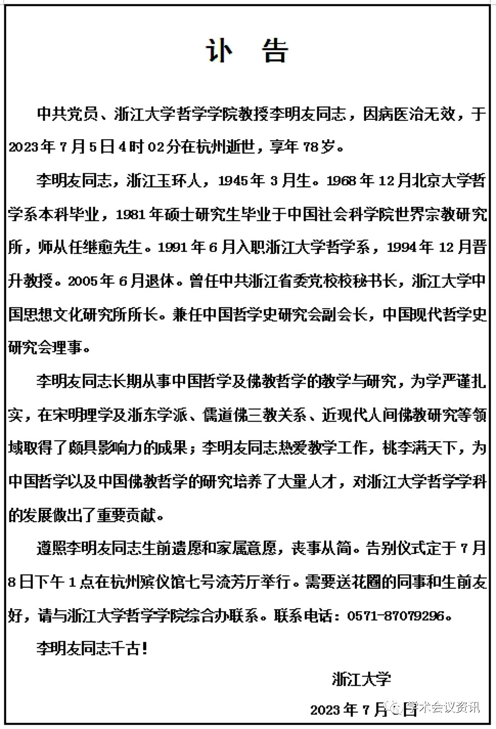7月5日,浙江大学讣告:中共党员、浙江大学哲学学院教授李明友同志,因病医治无效,于2023年7月5日4时02分在杭州逝世,享年79岁。