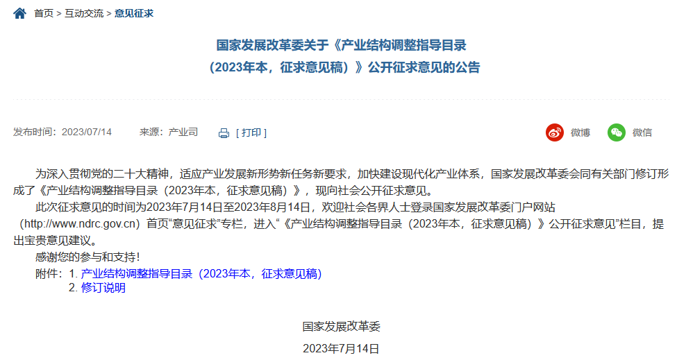 获悉,近日,国家发展改革委会同有关部门修订形成了《产业结构调整指导目录(2023年本,征求意见稿)》,征求意见的时间为2023年7月14日至2023年8月14日。目录由鼓励、限制和淘汰三大类组成,其中鼓励类主要是对经济社会发展有重要促进作用的技术、装备及产品。 图片来源:国家发改委官网 以下针对相关领域新能源、新材料有关的鼓励技术进行简要盘点,如需全文,可联系小编(微信号:dtmaterial)获取。 鼓励类 农林牧渔业 可再生资源综合利用:农作物秸秆综合利用(秸秆收储运体系建设、秸秆肥料化利用、秸秆饲料化利用、秸秆能源化利用、秸秆基料化利用、秸秆原料化利用等),农村可再生资源综合利用开发工程(沼气工程、生物天然气工程、“再生资综合利用、沼气发电、生物质能清洁供热、秸秆气化清洁能源利用工程、废弃菌棒利用、太阳能利用)。 电力 电力消纳和存储:电化学、压缩空气、飞轮、储氢(氨)、蓄热等各类新型储能技术推广应用,电动汽车充电设施,高效电能替代技术及设备,船舶充换电设施、港口船舶岸电设施建设和应用,跨季节储能技术。 新能源 1、风力发电技术与应用:15MW 等级及以上海上风电机组技术开发与设备制造,漂浮式海上风电技术,高原、山区风电场建设与设备生产制造,海上风电场建设与设备及海底电缆制造,稀土永磁材料在风力发电机中应用。 2、可再生能源利用技术与应用:太阳能热发电集热系统、太阳能光伏发电系统集成技术开发应用,逆变控制系统开发制造,电解水制氢和二氧化碳催化合成绿色甲醇,太阳能建筑一体化组件设计与制造,高效太阳能热水器及热水工程,太阳能中高温利用技术开发与设备制造,海洋能、地热能利用技术开发与设备制造,可再生能源供暖技术的开发与应用。 3、生物质能发电技术与应用:生物质纤维素乙醇、生物燃油(柴油、汽油、航空煤油)等非粮生物质燃料生产技术开发与应用,生物质直燃、气化发电及热电联产技术开发与设备制造,农林生物质资源收集、运输、储存技术开发与设备制造等。 4、氢能技术与应用:高效经济制氢、运氢及高密度储氢技术开发应用及设备制造,加氢站及车用清洁替代燃料加注站,移动新能源技术开发及应用,新一代氢燃料电池技术研发与应用,可再生能源制氢,液态、固态和气态储氢,管道拖车运氢,管道输氢,加氢站,氢电耦合等氢能技术推广应用。 5、发电互补技术与应用:氢能、风电与光伏发电互补系统技术开发与应用,传统能源与新能源发电互补技术开发及应用 有色金属 1、信息材料。半导体、芯片用电子级多晶硅(包括区熔用多晶硅材料)、硅单晶(直径 200mm 以上)及碳化硅单晶、硅基电子气体、磷化铟单晶、多晶锗、锗单晶等,直径 125mm 以上直拉或直径 50mm 以上水平生长化合物半导体材料、铝铜硅钨钼稀土等大规格高纯靶材、超高纯稀有金属及靶材、超大规模集成电路铜镍硅和铜铬锆引线框架材料、电子焊料等。 2、新能源材料。硅能源(晶硅光伏)材料,包括配套的高纯多晶硅(包括棒状多晶硅和颗粒硅)、高效单晶硅棒、高效单晶硅片;核级海绵锆及锆材、高容量长寿命锂离子电池用三元和多元、磷酸铁锂等正极材料,前驱体材料。 3、交通运输、高端制造及其他领域。航空航天、海洋工程、数控机床、轨道交通、核工程、新能源、先进医疗装备、环保节能装备等高端制造用轻合金材料、铜镍金属材料、稀有稀土金属材料、贵金属材料、复合金属材料、金属陶瓷材料、助剂材料、生物医用材料、催化材料、3D 打印材料、高性能硬质合金材料及其工具。 4、新能源、半导体照明、电子领域用连续性金属卷材、真空镀膜材料、高性能箔材。 石化化工 1、涂料:低 VOCs 含量的环境友好、资源节约型涂料,用于大飞机、高铁、大型船舶、新能源、电子等重点领域的高性能涂料及配套树脂开发与生产。 2、树脂:用于生产乙烯等产品的电加热蒸汽裂解技术,乙烯-乙烯醇共聚树脂等高性能阻隔树脂,聚异丁烯、乙烯-辛烯共聚物、茂金属聚乙烯等特种聚烯烃及高碳α-烯烃等关键原料的开发与生产,芳族酮聚合物、聚芳醚醚腈、满足 5G 应用的液晶聚合物、电子级聚酰亚胺等特种工程塑料生产以及共混改性、合金化技术开发和应用,可降解聚合物的开发与生产,长碳链尼龙、耐高温尼龙等新型聚酰胺开发与生产。 3、橡胶:万吨级液体丁基橡胶、官能团改性的溶聚丁苯橡胶、氢化丁腈橡胶、高乙烯基聚丁二烯橡胶(HVBR)、集成橡胶(SIBR)、丁戊橡胶、异戊二烯胶乳开发与生产,合成橡胶化学改性技术开发与应用,湿法(液相)和低温连续橡胶混炼技术,热塑性聚酯弹性体(TPEE)、氢化苯乙烯-异戊二烯热塑性弹性体(SEPS)等热塑性弹性体材料开发与生产,新型天然橡胶开发与应用。 4、关键新材料:低 VOCs 含量胶粘剂,环保型水处理剂,新型高效、环保催化剂和助剂,功能性膜材料,超净高纯试剂、光刻胶、电子气 5、硅材料:苯基氯硅烷、乙烯基氯硅烷等新型有机硅单体,苯基硅橡胶、苯基硅树脂及杂化材料的开发与生产。 6、氟材料:全氟烯醚等特种含氟单体,聚全氟乙丙烯、聚偏氟乙烯、聚三氟氯乙烯、乙烯-四氟乙烯共聚物等高品质氟树脂,氟醚橡胶、氟硅橡胶、四丙氟橡胶、高含氟量 246 氟橡胶等高性能氟橡胶,含氟润滑油脂,消耗臭氧潜能值(ODP)为零、全球变暖潜能值(GWP