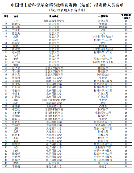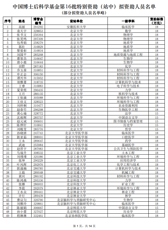 根据《中国博士后科学基金资助规定》,经专家评审,遴选出中国博士后科学基金第5批特别资助(站前)和第16批特别资助(站中)共1200名拟资助人员,现对名单进行公示(部分拟资助人员由相关单位和部门另行组织内部公示)。